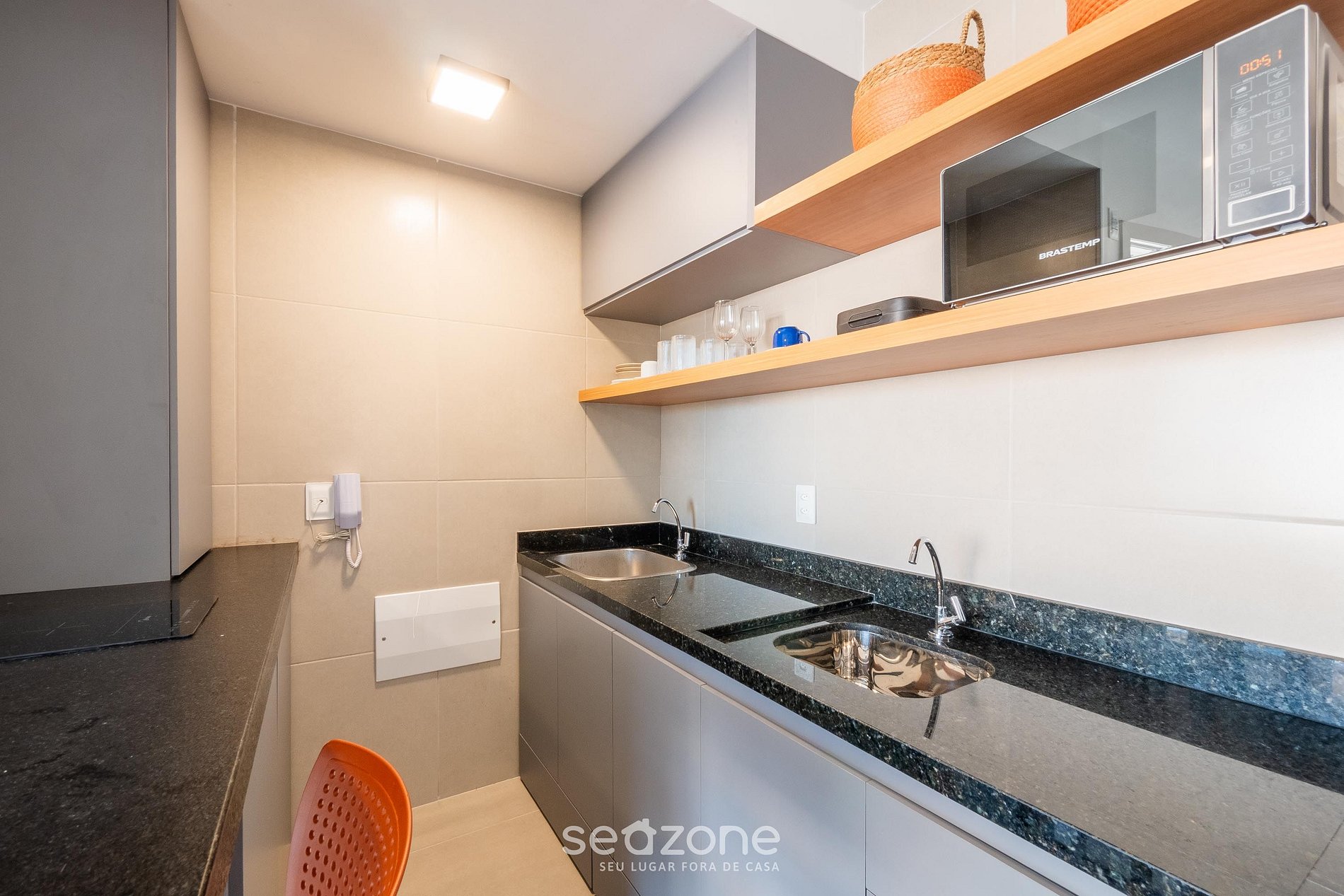 - Cocina totalmente equipada con refrigerador, placa de inducción, microondas, sandwichera, cafetera (con portafiltro y termo), licuadora, copas de vino, ollas, vajilla y utensilios;