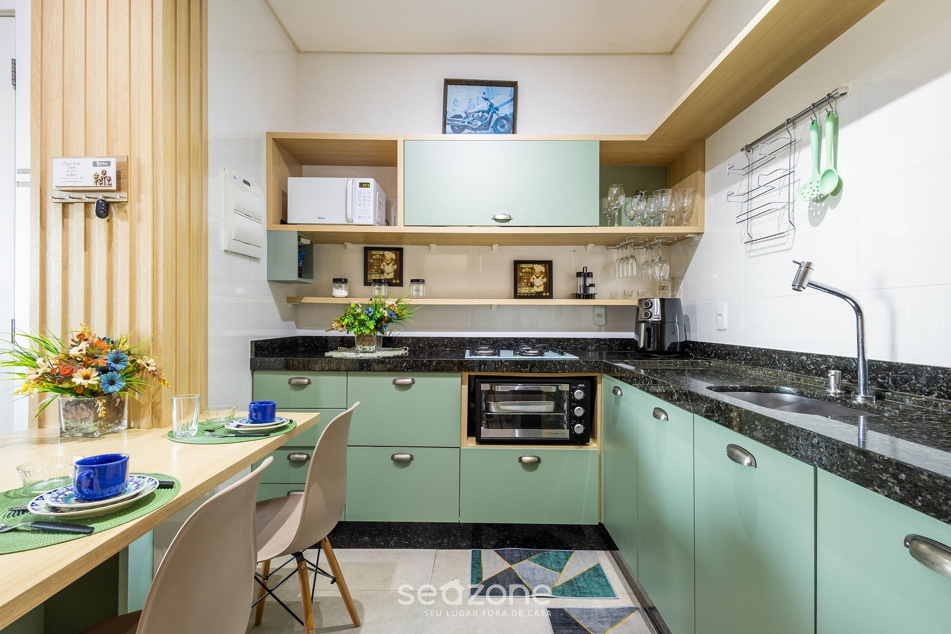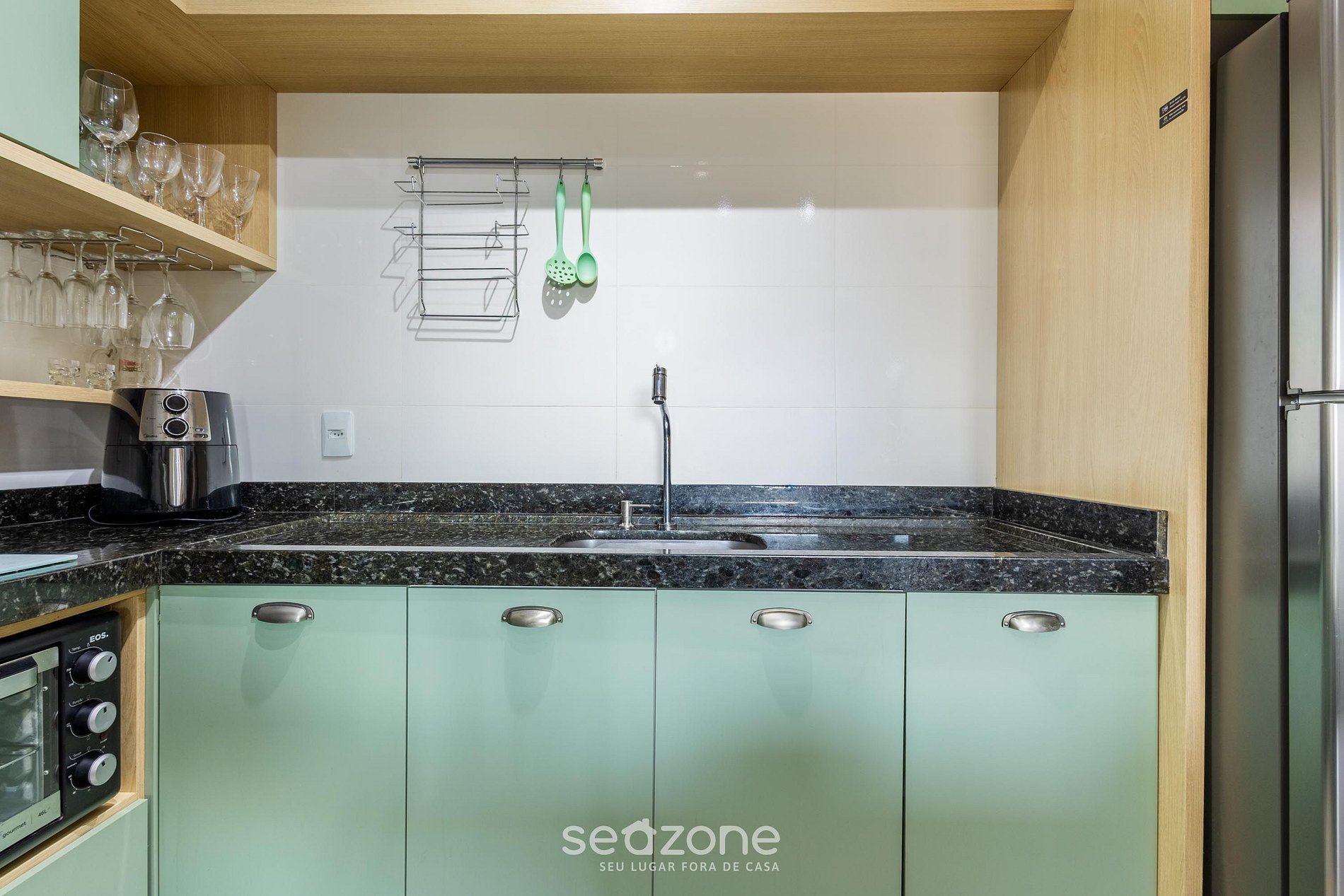 - Cocina completa con refrigerador, cocina tipo cooktop, horno eléctrico, microondas, airfryer, licuadora, cafetera eléctrica, hervidor eléctrico, copas de vino, ollas, vajilla y utensilios;