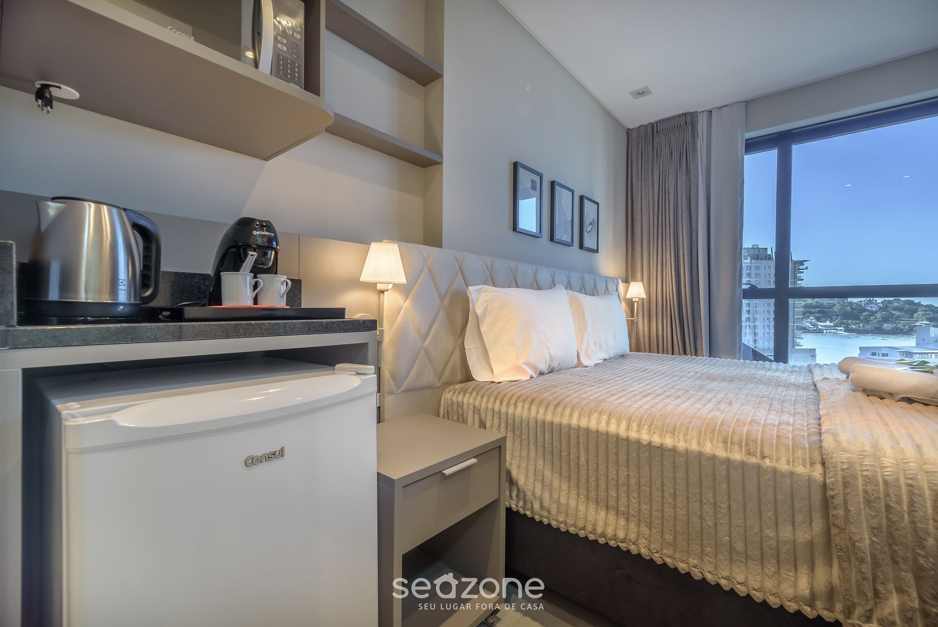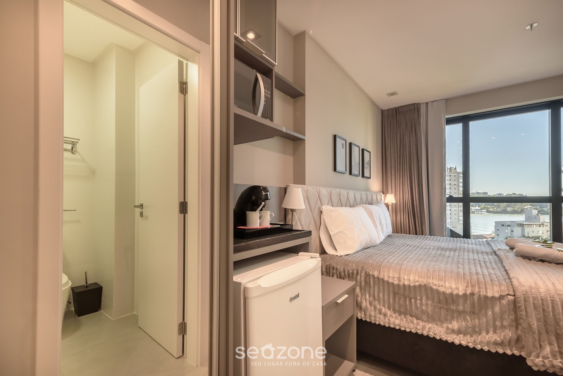 - Cocina compacta con microondas (su opción práctica para comidas rápidas durante la estadía), además de frigobar, cafetera, hervidor eléctrico, copas de vino, vajilla y utensilios esenciales para el día a día;