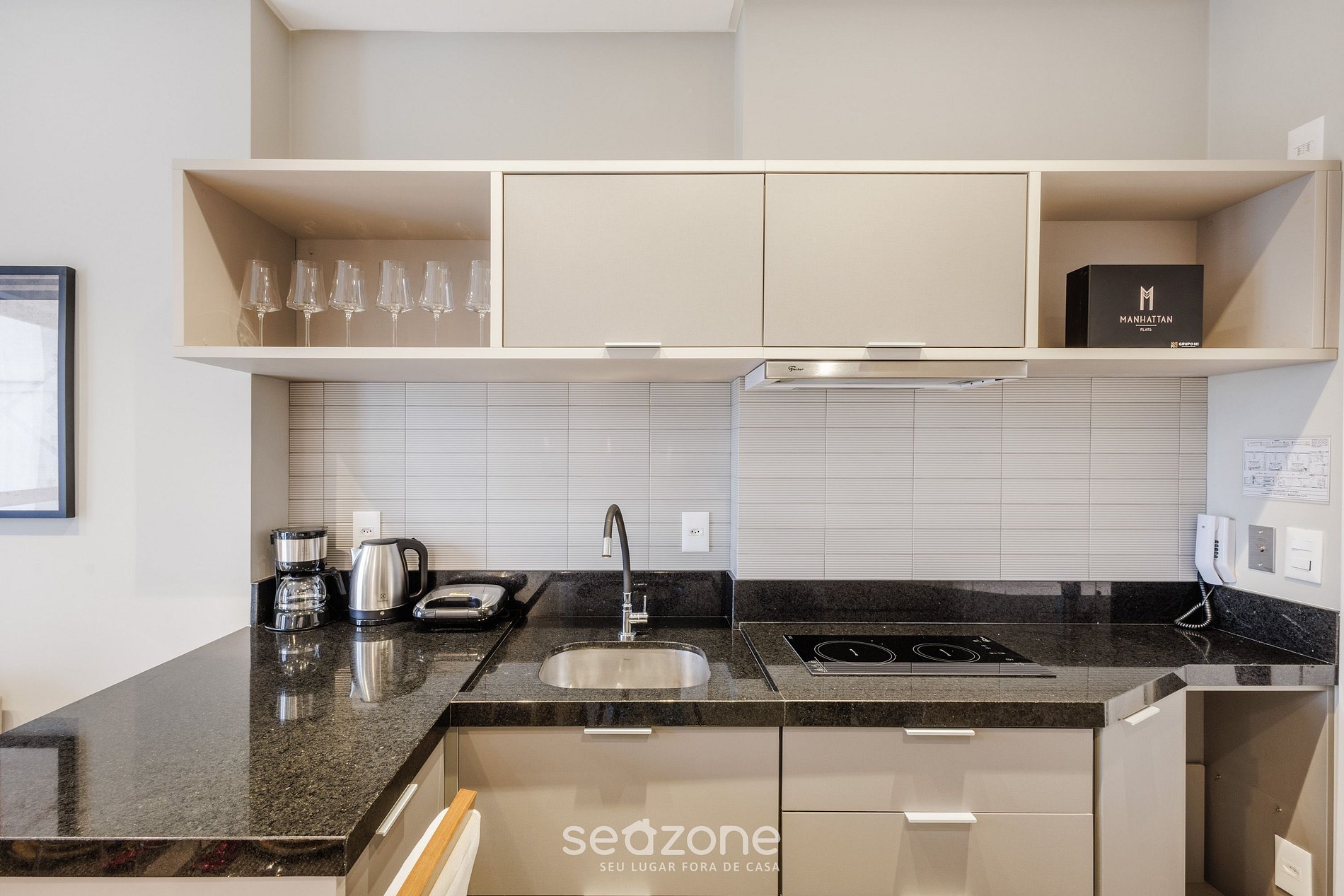 - Cocina completa con refrigerador, cooktop de inducción, horno eléctrico, microondas, sandwichera, cafetera eléctrica, tetera eléctrica, copas de vino, ollas, vajilla y utensilios;