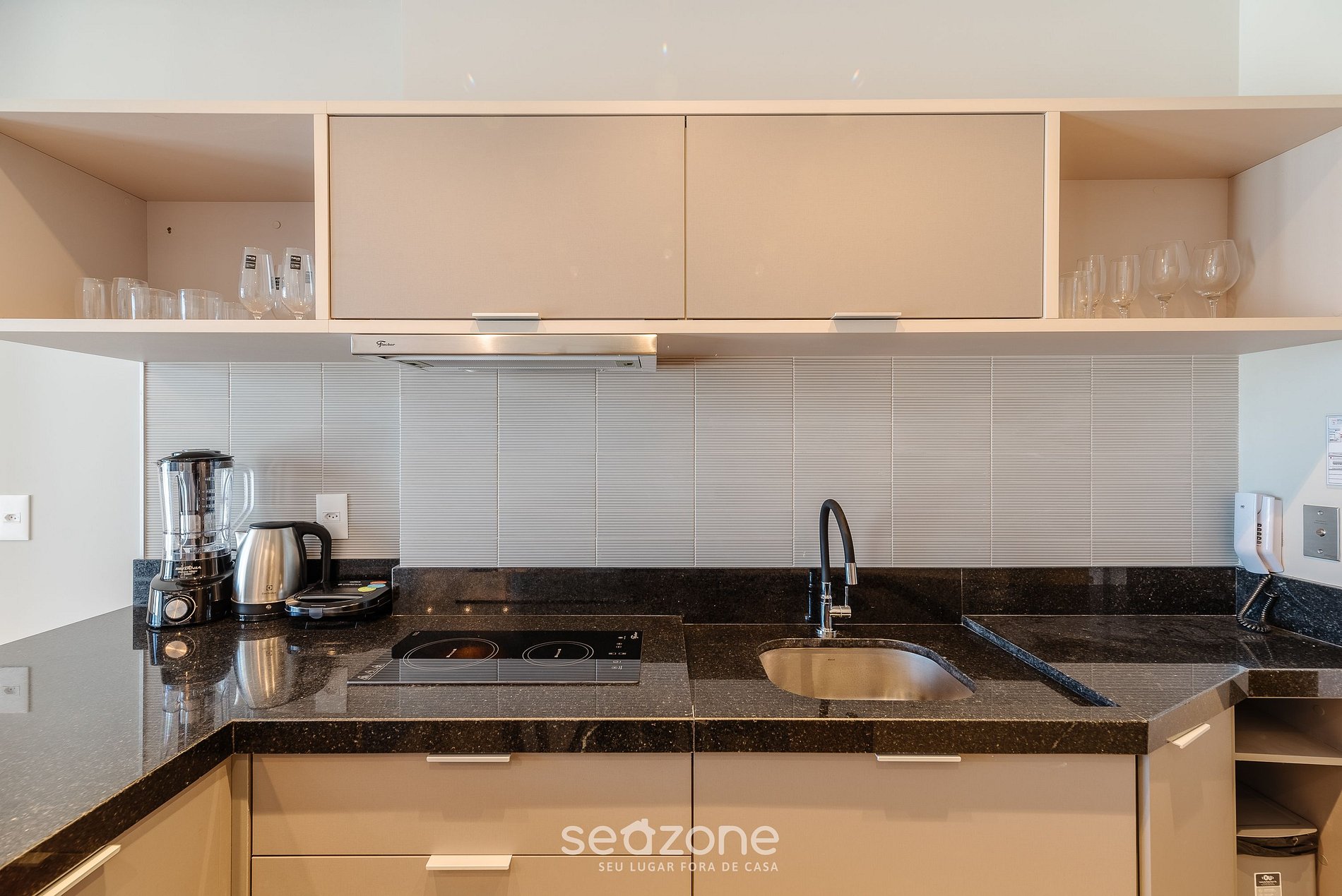 - Cocina completa con refrigerador, cooktop de inducción, horno eléctrico, microondas, sandwichera, cafetera eléctrica, tetera eléctrica, copas de vino, ollas, vajilla y utensilios;