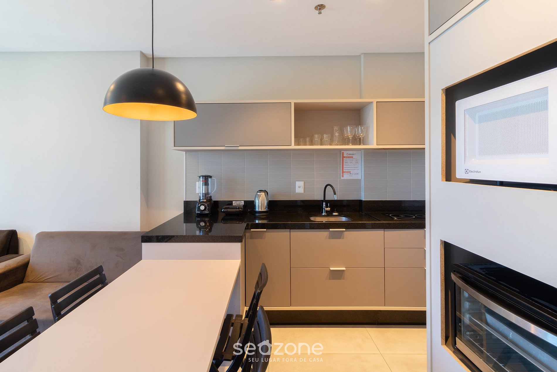 - Cocina completa con refrigerador, cooktop de inducción, horno eléctrico, microondas, sandwichera, cafetera eléctrica, tetera eléctrica, copas de vino, ollas, vajilla y utensilios;