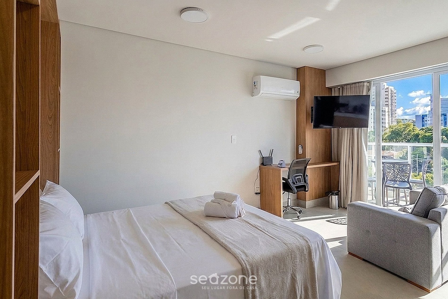 Disfruta de una excelente estancia en este moderno estudio en el corazón de la ciudad. Climatizado y bien diseñado, el espacio ofrece cama doble, cocina equipada y un balcón con vista, combinando confort y practicidad. El condominio cuenta con piscina, gimnasio y área de coworking para tus momentos de ocio o trabajo. En una ubicación estratégica, tendrás fácil acceso a panaderías, restaurantes, cafeterías y farmacias, además de estar junto a un estadio de fútbol.