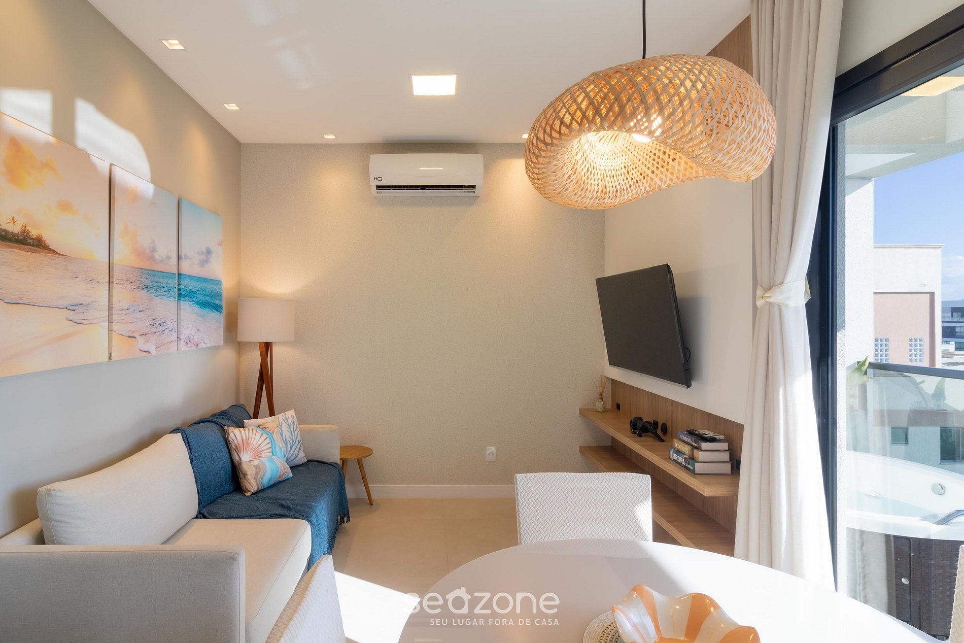 - Sala de estar con sofá, Smart TV y aire acondicionado;