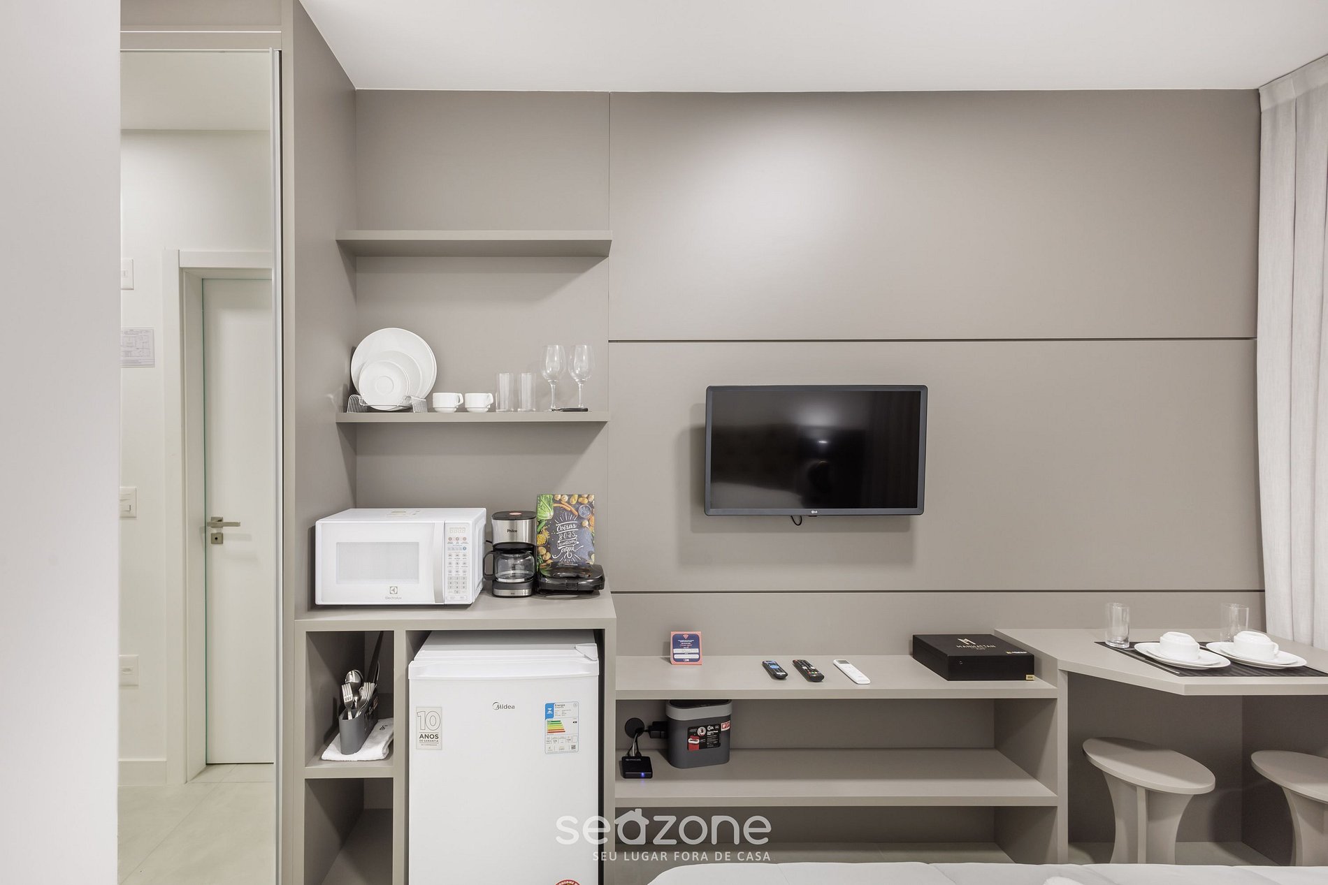 - Cocina compacta con microondas (su opción práctica para comidas rápidas durante la estadía), además de frigobar, cafetera, hervidor eléctrico, copas de vino, vajilla y utensilios esenciales para el día a día;