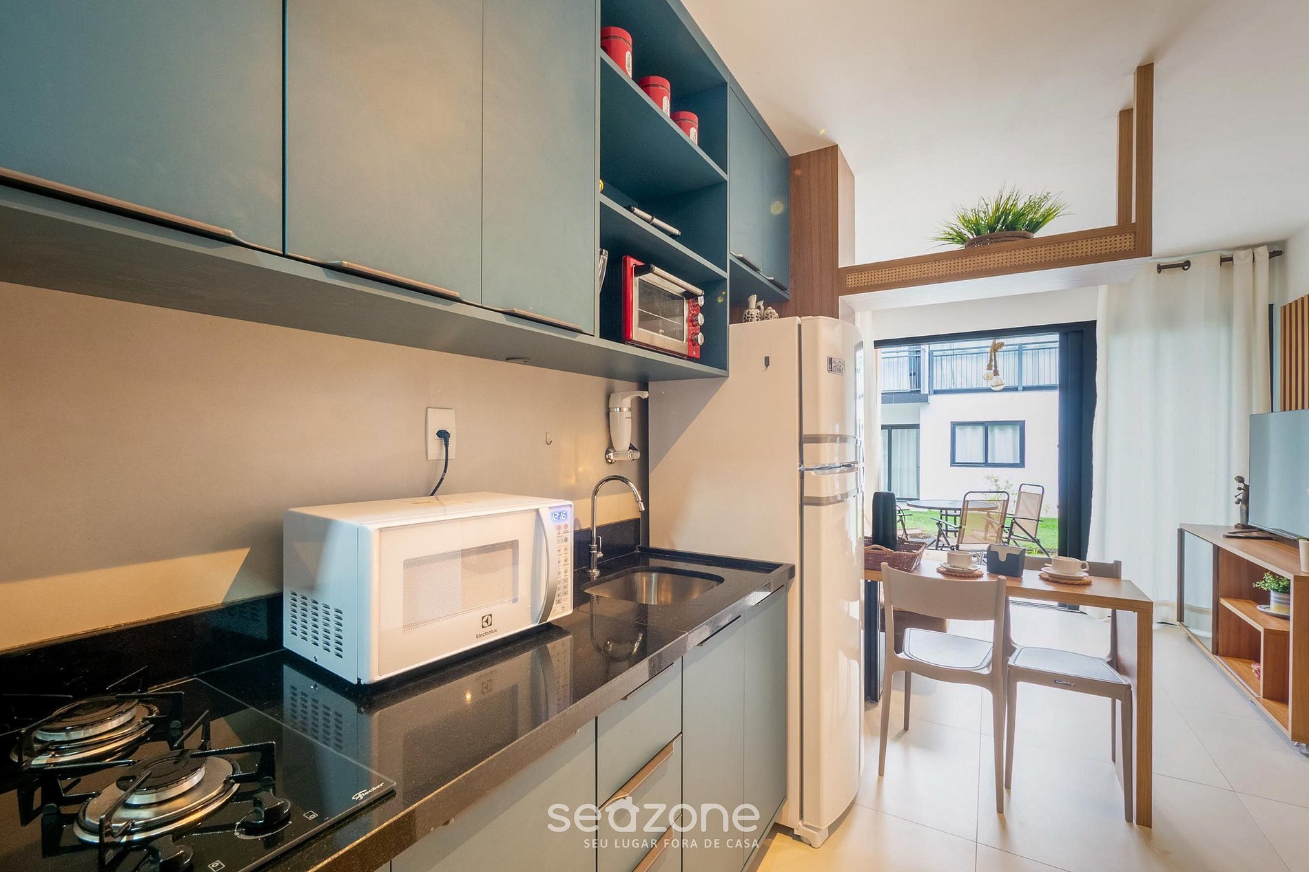 - Cocina completa con refrigerador, congelador, enfriador de cerveza, estufa de inducción (cooktop), horno eléctrico, microondas, sanduichera, airfryer, cafetera (kit de filtro), tetera, licuadora, copas de vino, ollas y utensilios;