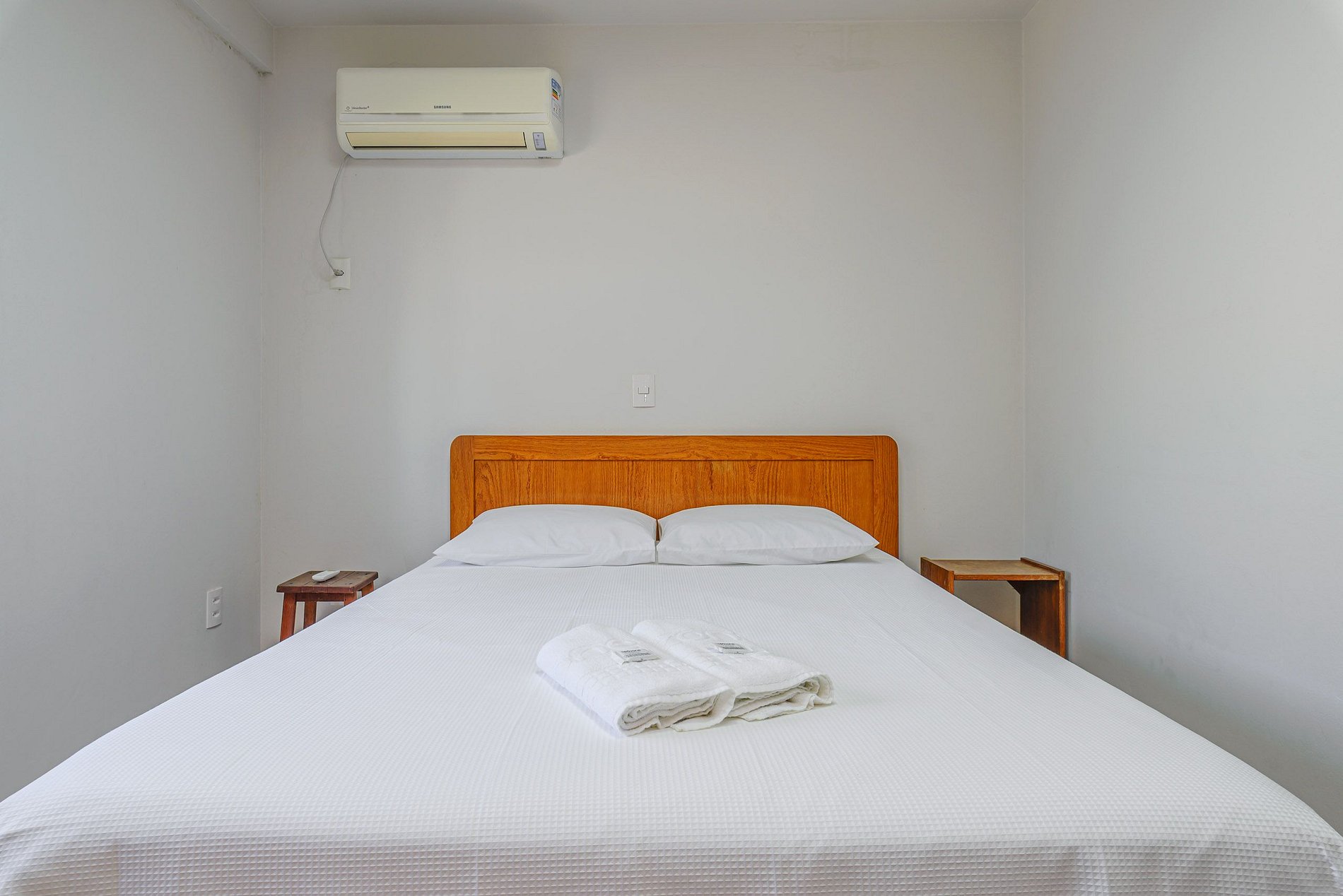 - 1 dormitorio con cama doble, cómoda para guardar ropa y aire acondicionado;