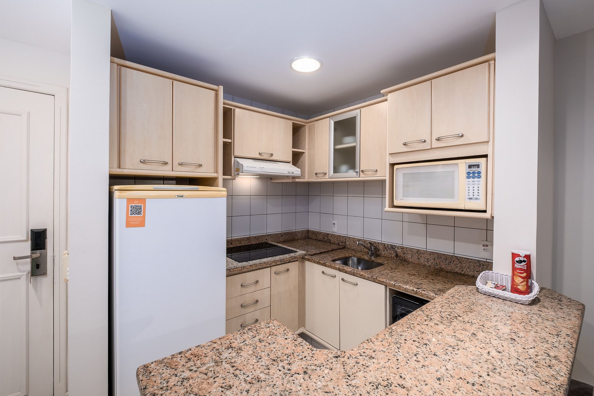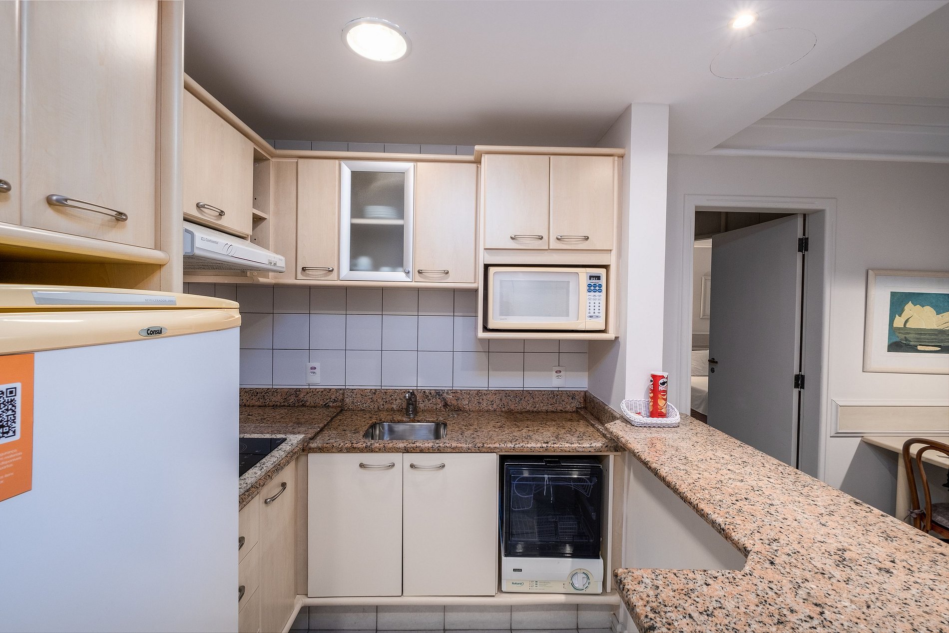 - Kitchenette con cocina de inducción, microondas, lavavajillas, sandwichera, cafetera, frigobar y utensilios de cocina;