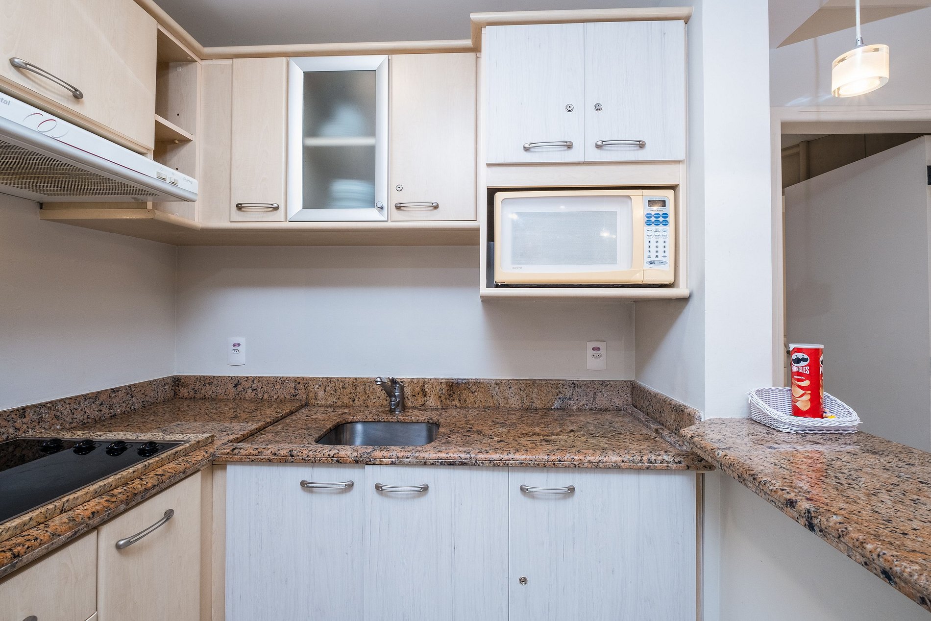 - Kitchenette con cocina de inducción, microondas, sandwichera, frigobar y utensilios de cocina;