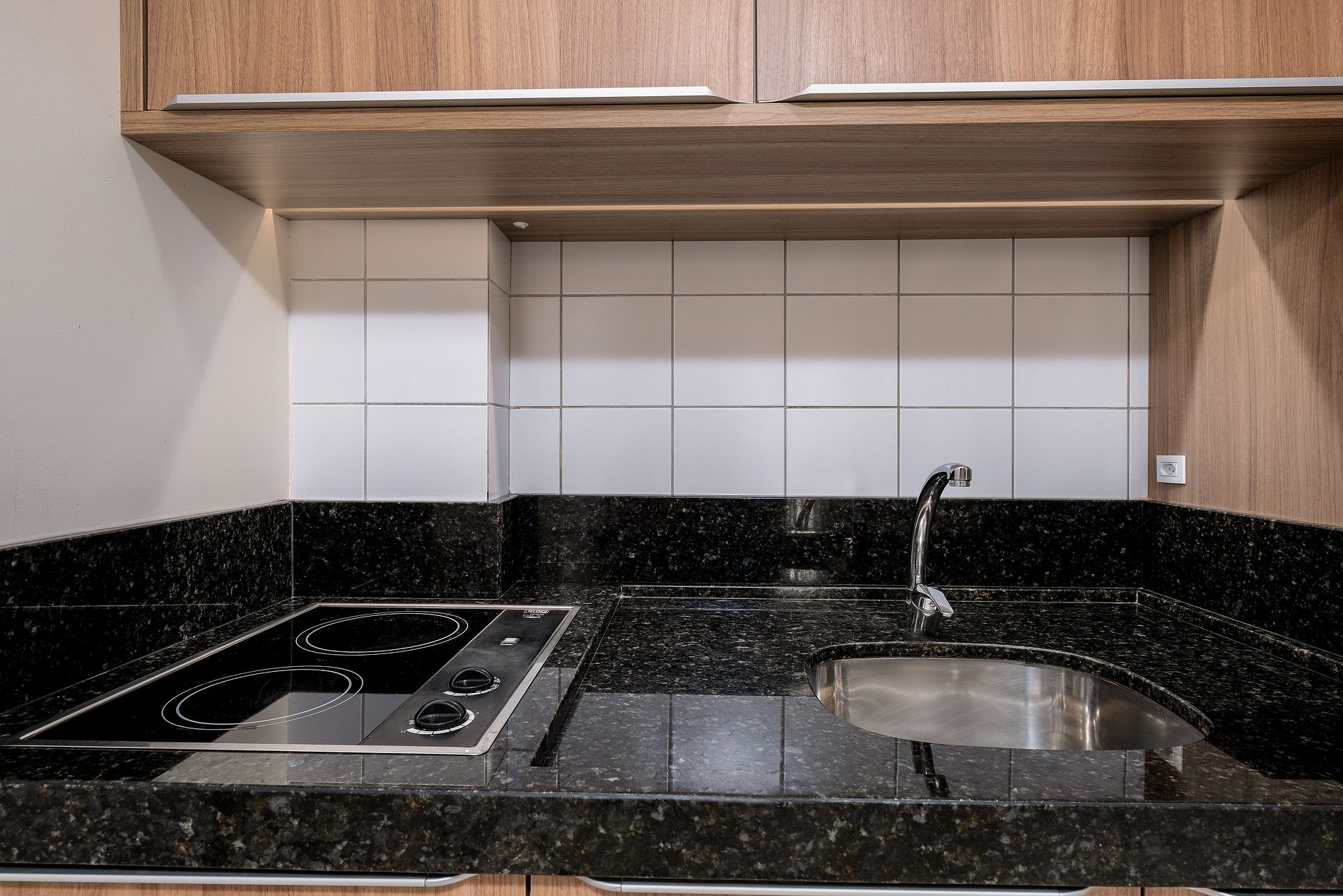 - Mini cocina con cocina de vitrocerámica, microondas, frigobar y utensilios domésticos;