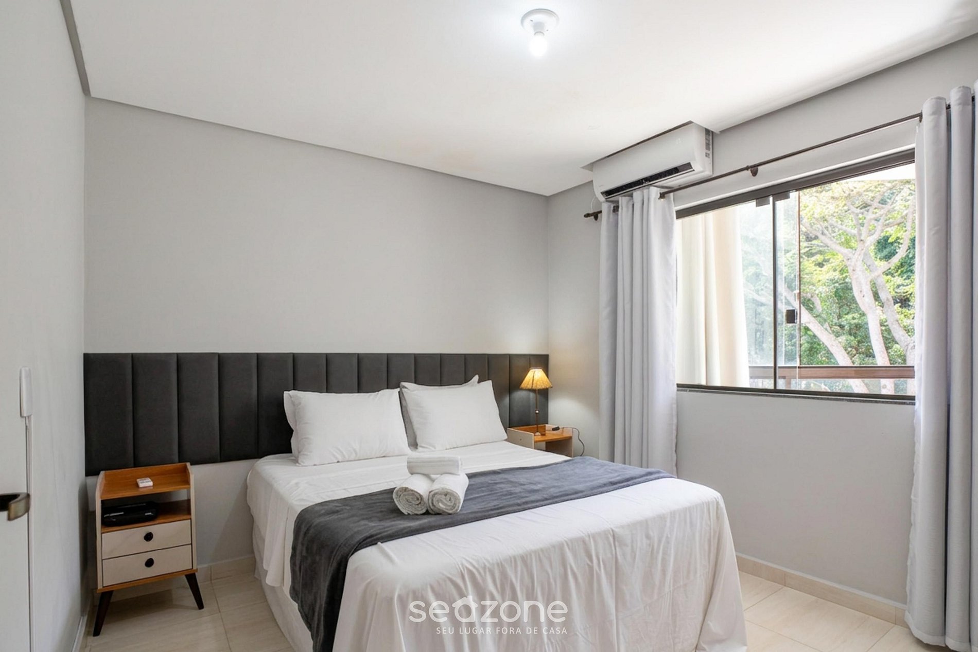 - Quarto com 1 cama queen size, armario y aire acondicionado;