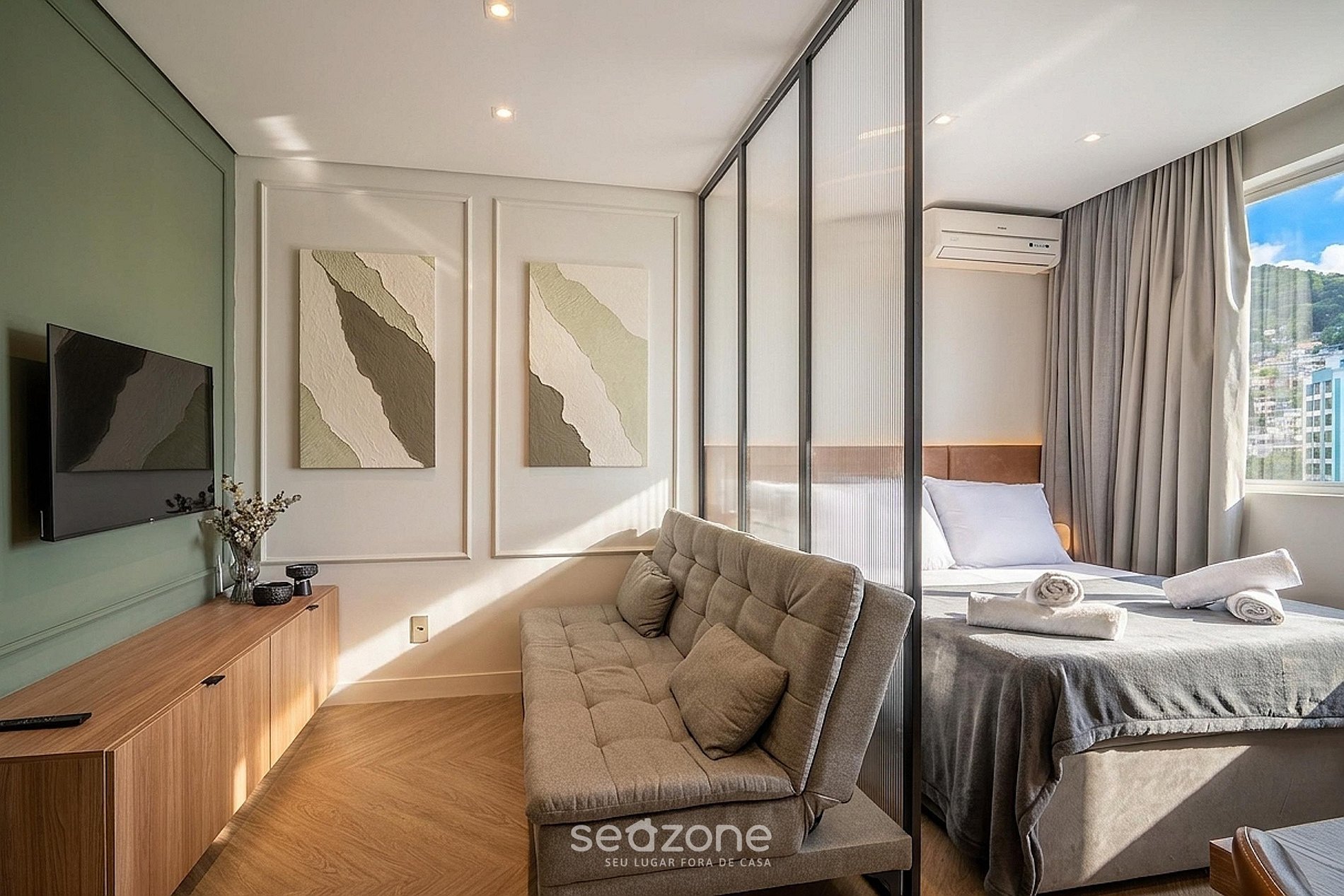 - Estudio con 1 cama queen size, 1 sofá cama doble, Smart TV y aire acondicionado split;