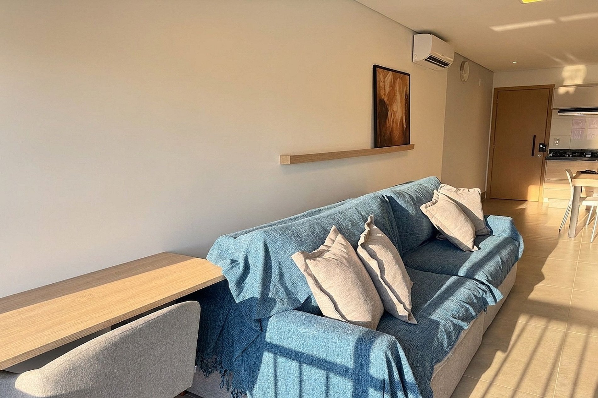 - Sala de estar con sofá, mesa y sillas, y aire acondicionado;