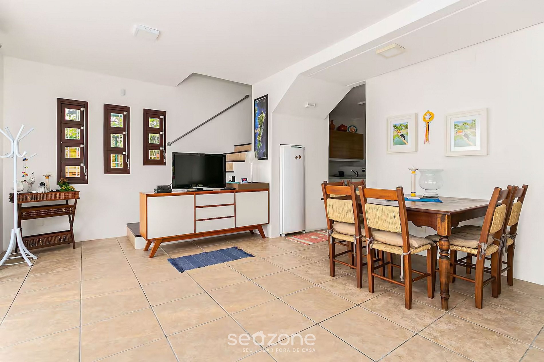 - Sala integrada al comedor, con sofá, TV pantalla plana y mesa con 5 sillas;