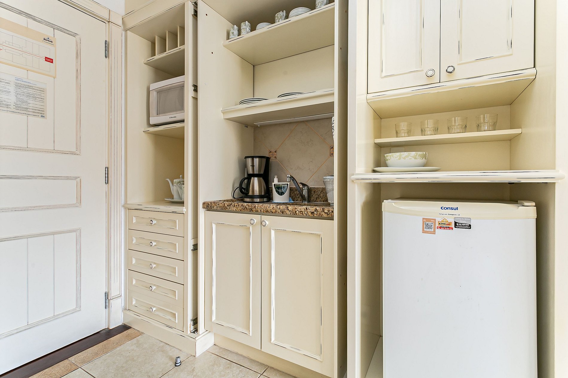 - Mini cocina con microondas, frigobar y utensilios domésticos;