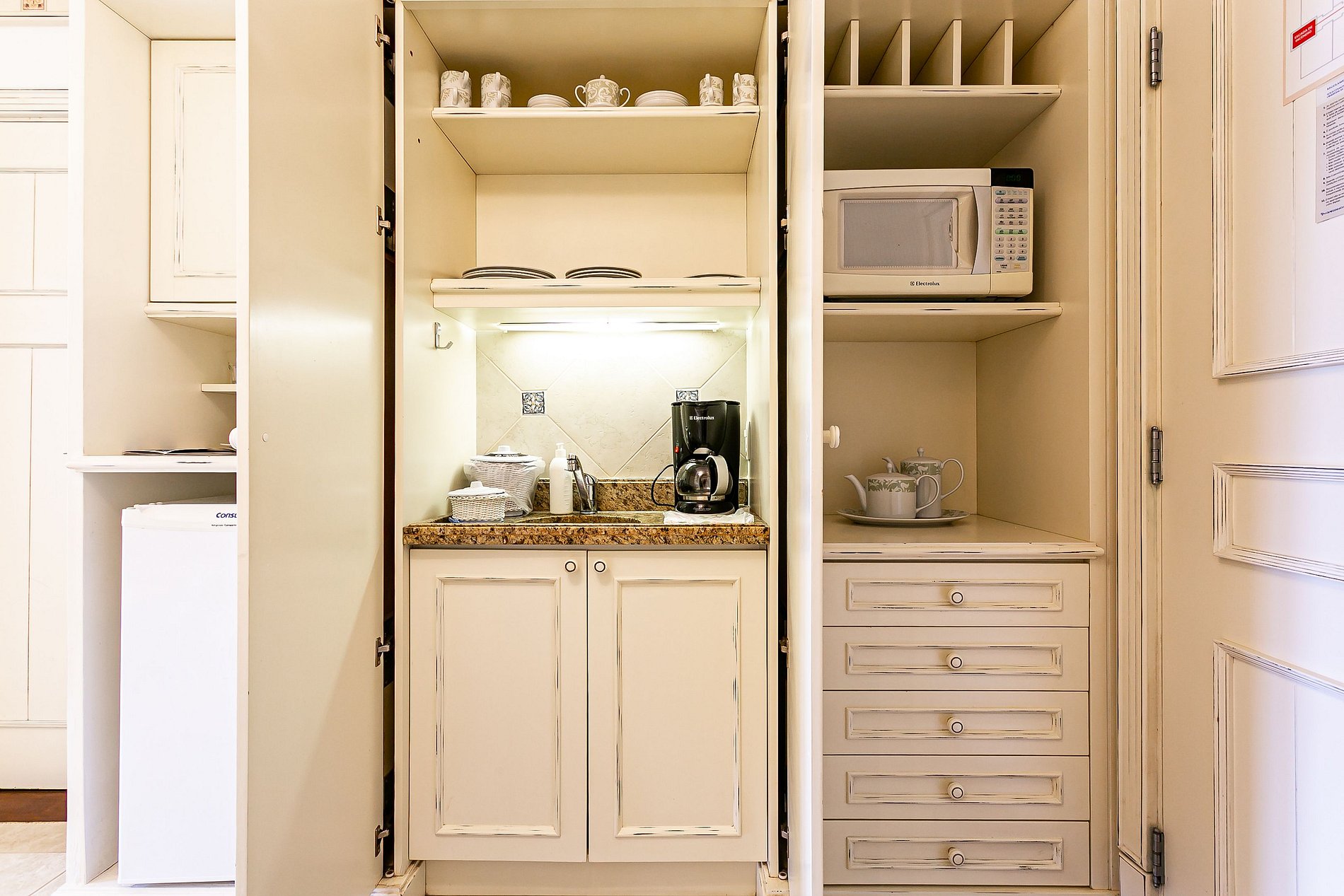 - Mini cocina con microondas, nevera y menaje de hogar;