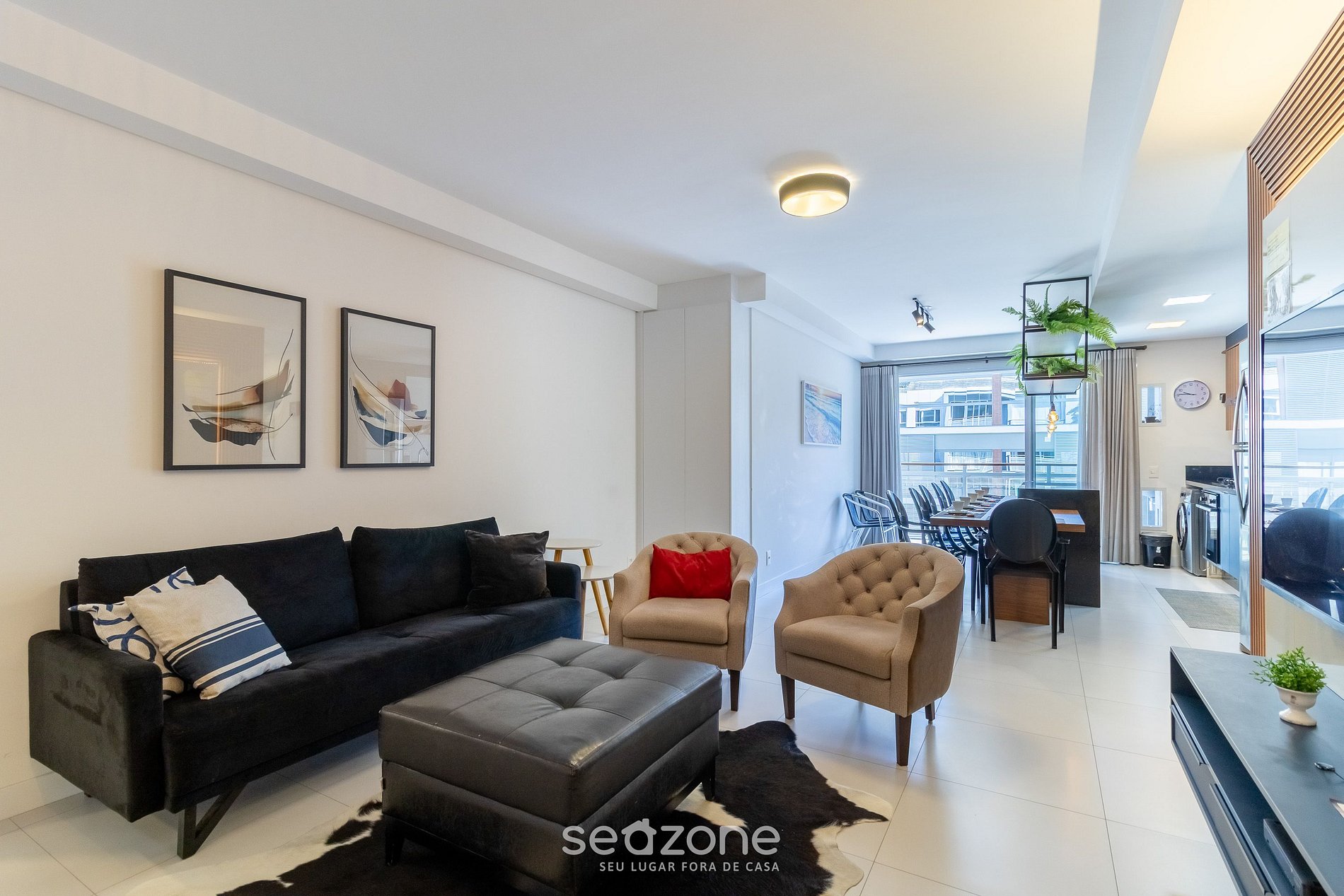- Sala de estar con sofá, sillones, pufs, Smart TV, aire acondicionado (espacio integrado con la cocina);