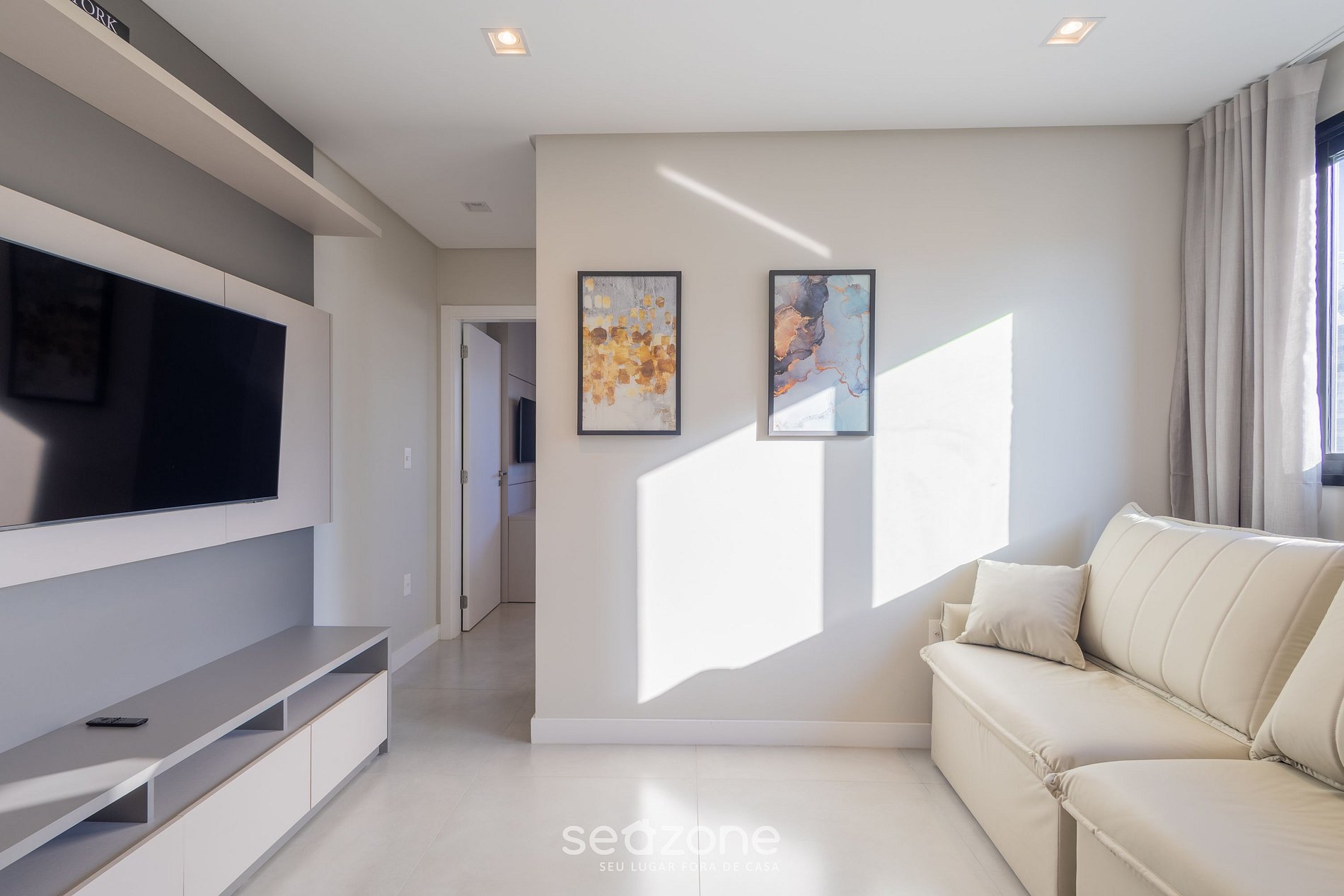 - Sala de estar con sofá cama matrimonial, cortinas blackout, Smart TV y aire acondicionado;