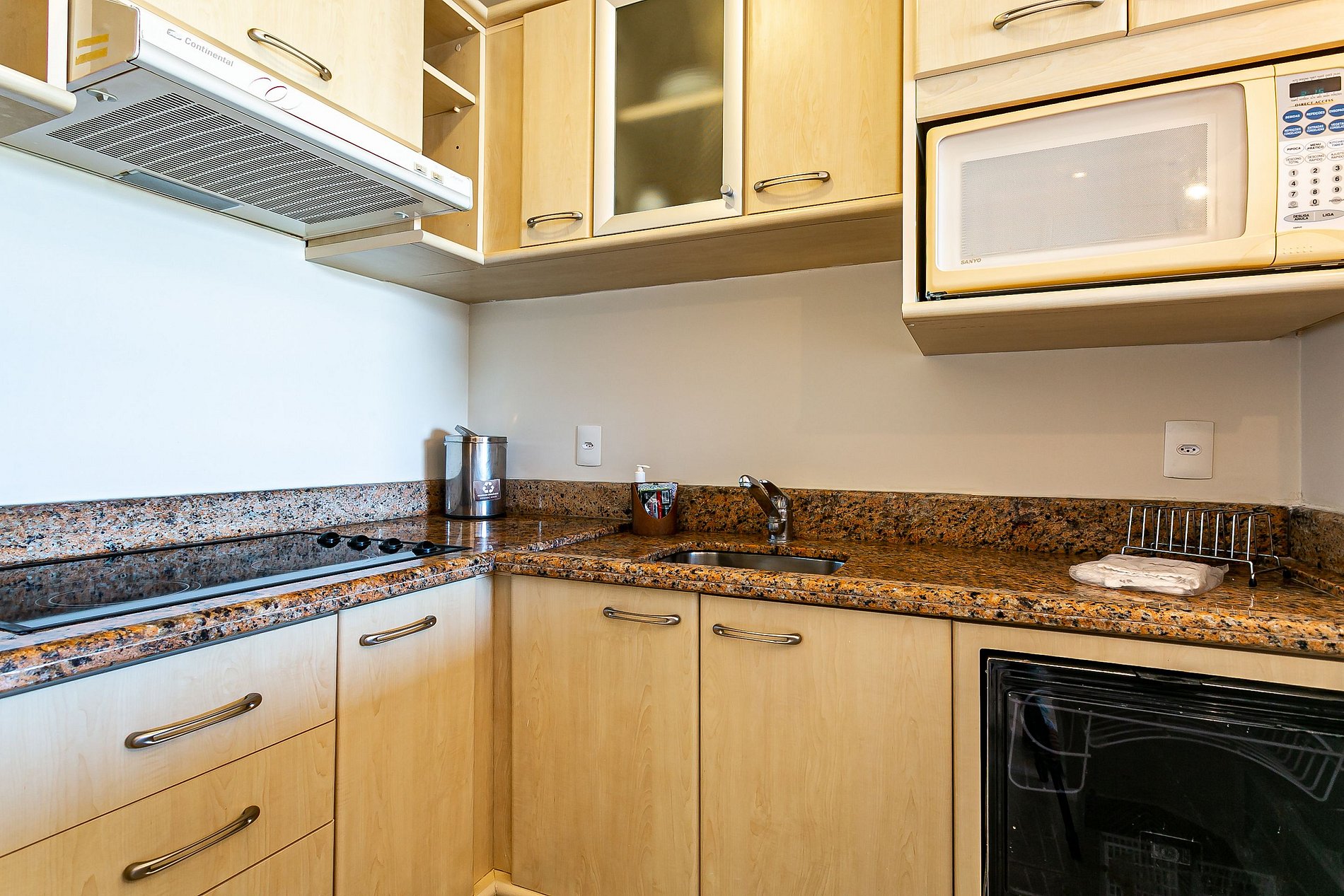 - Cocina compacta con refrigerador, estufa, lavavajillas, sandwichera y microondas;