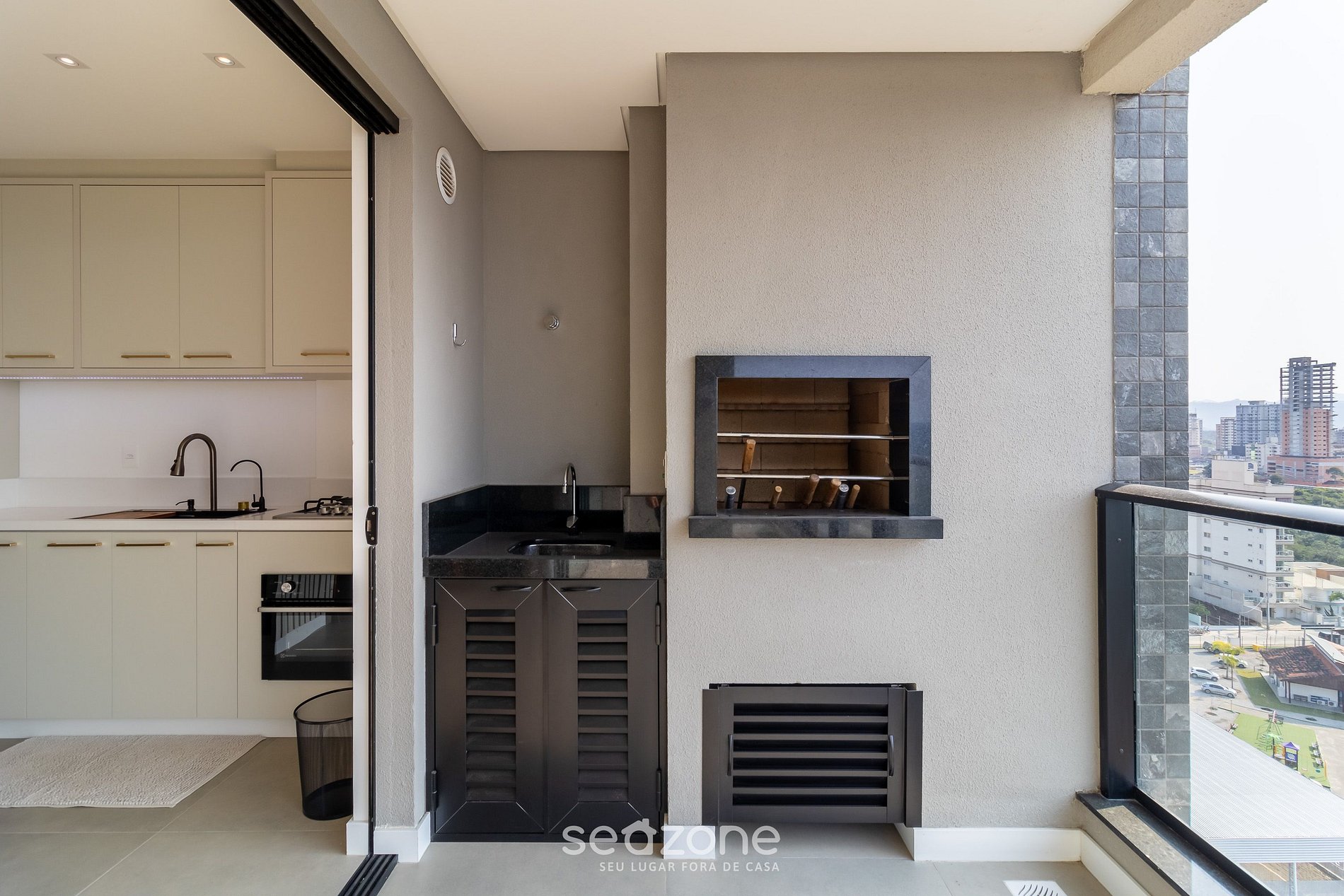- Amplio balcón con cerramiento, churrasqueira y muebles exteriores;