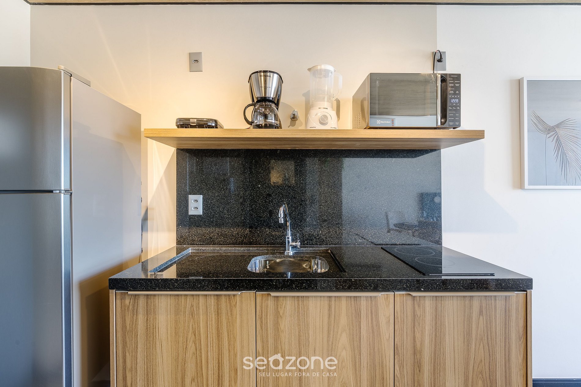 - Cocina equipada con frigobar, cocina de inducción, microondas, sandwichera, cafetera eléctrica, licuadora, copas de vino, ollas, vajilla y utensilios;