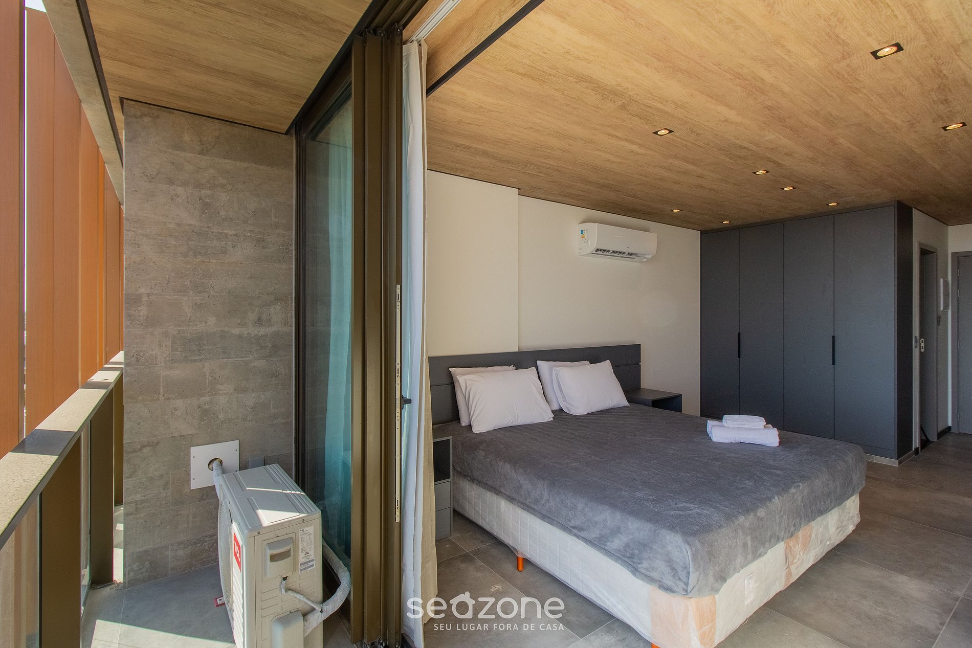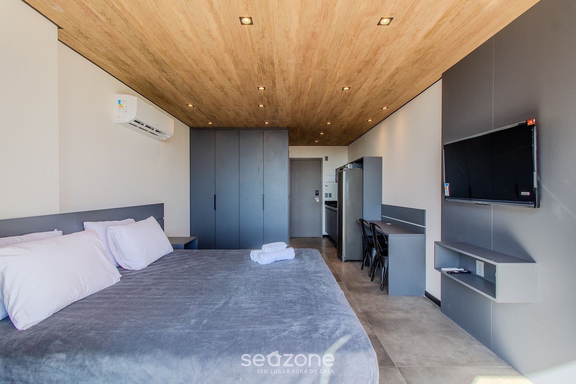 - 1 cama matrimonial king size, closet, Smart TV de pantalla plana y aire acondicionado;