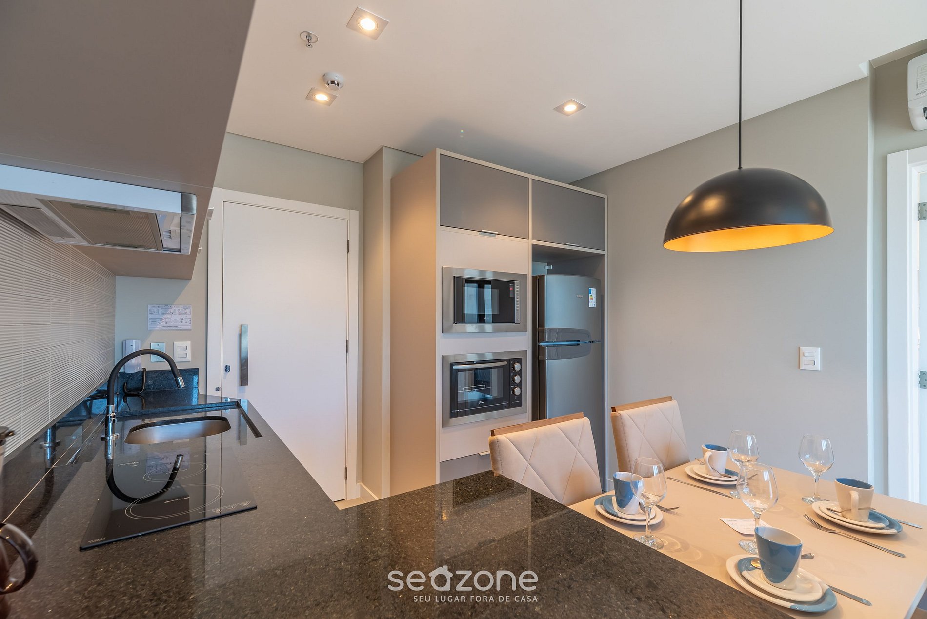 - Cocina completa con refrigerador, cooktop de inducción, horno eléctrico, microondas, sandwichera, cafetera eléctrica, teter