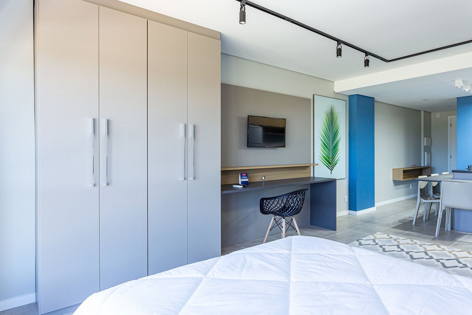 - Estudio con cama doble, sofá cama (solo para 1 persona), closet, TV y cocina integrada;