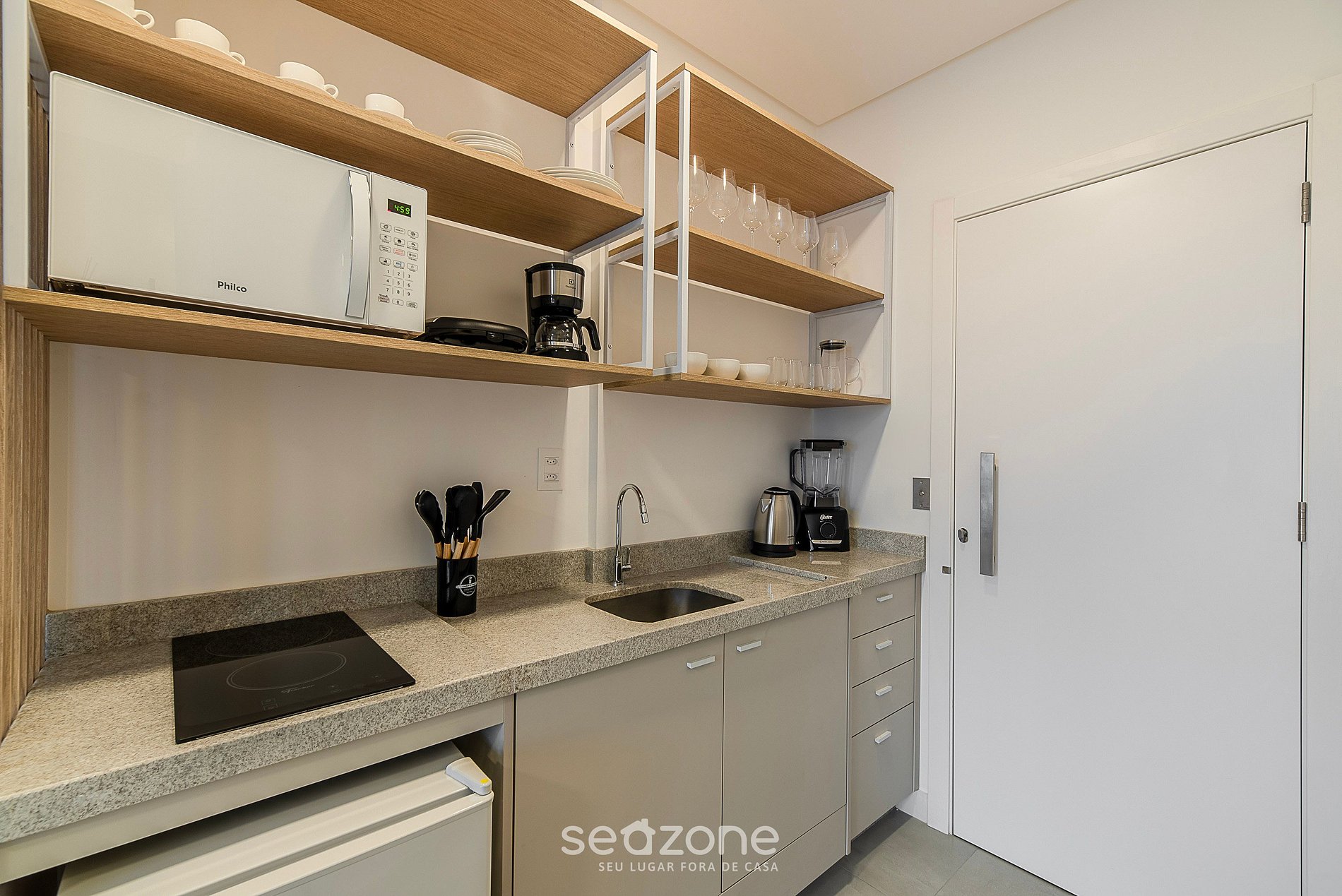 - Frigobar, cocina, microondas, cafetera eléctrica, tetera eléctrica, sándwich, copas de vino, vajilla y utensilios;