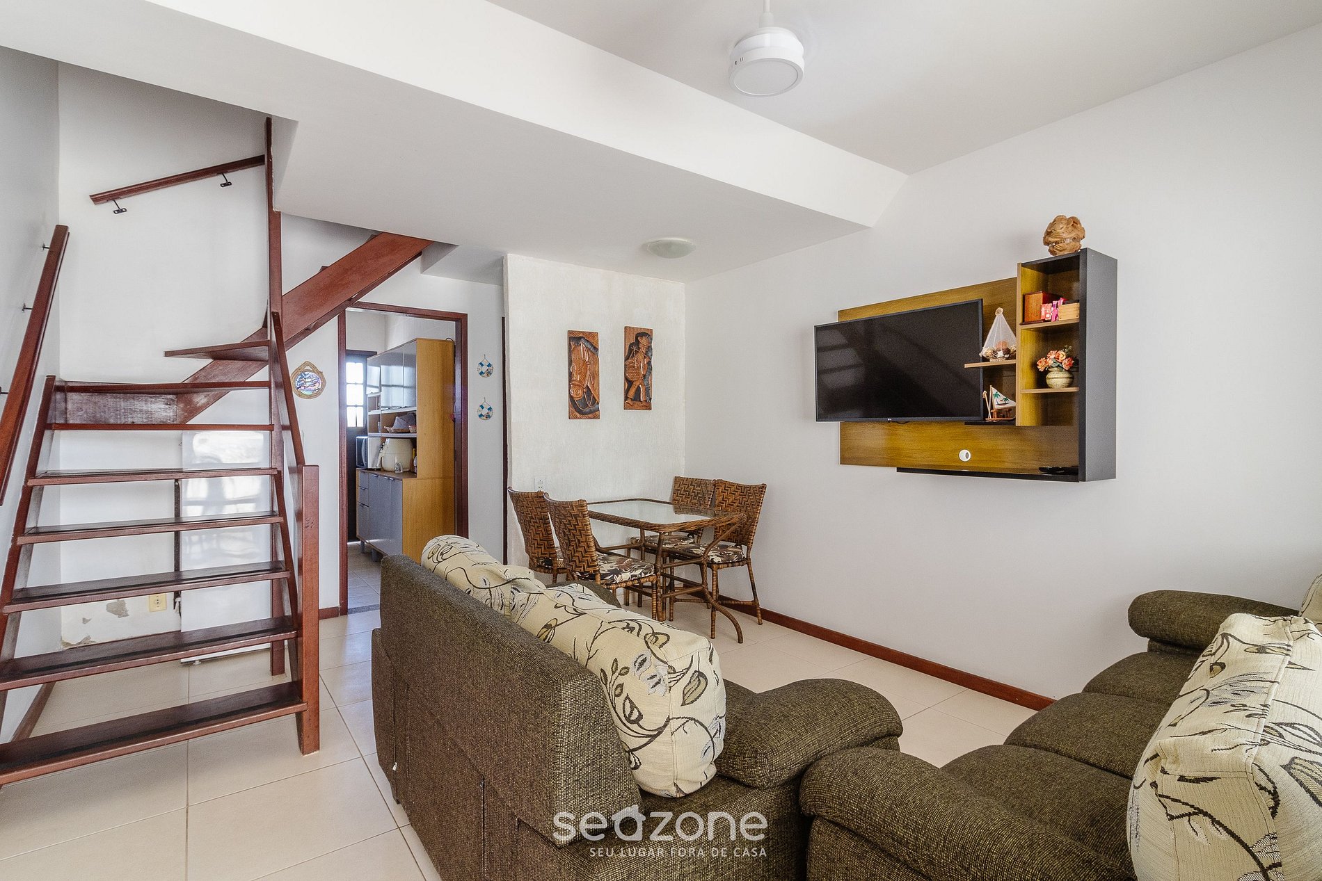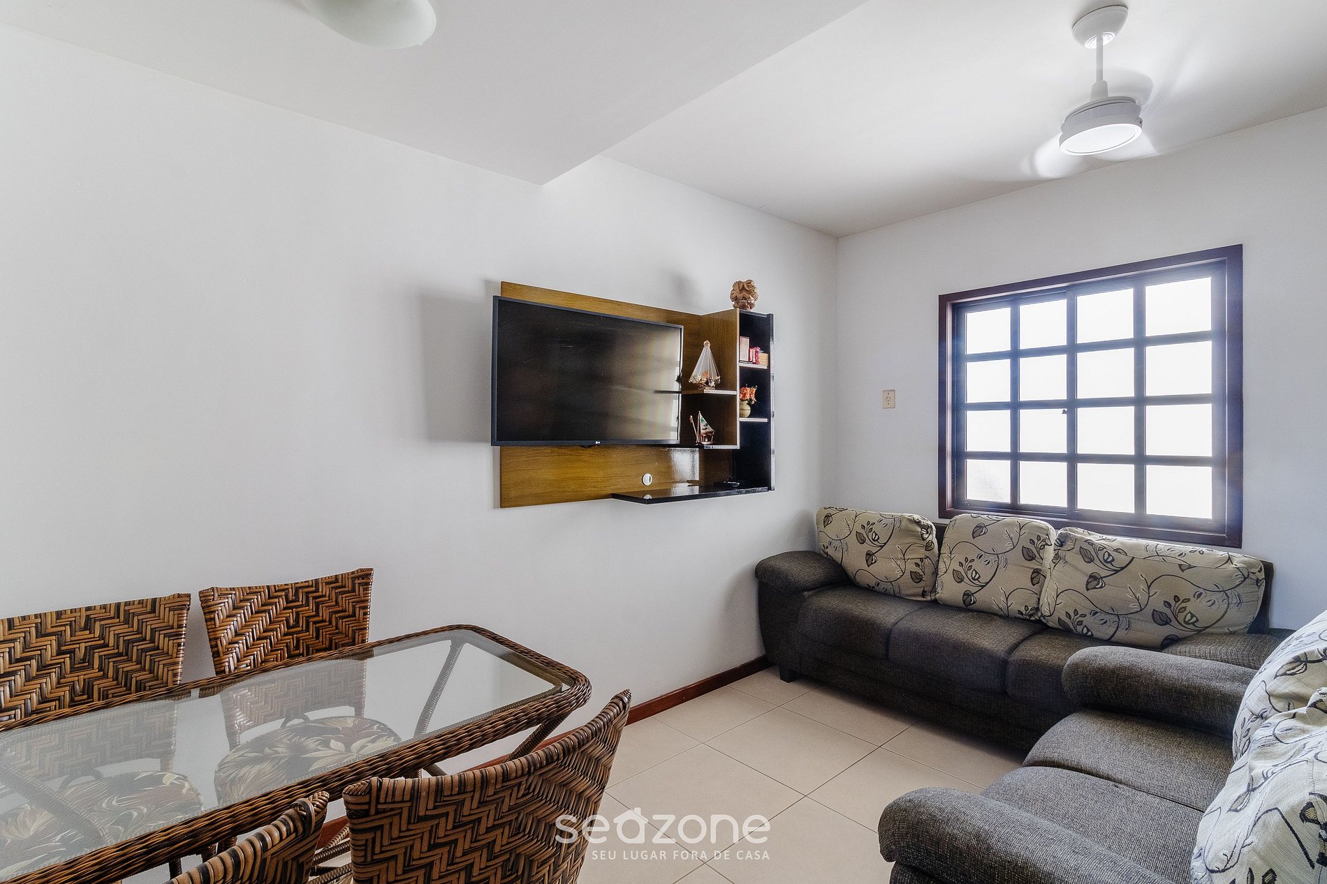 - Sala con sofá, smart TV, mesa con 4 sillas y ventilador de techo;