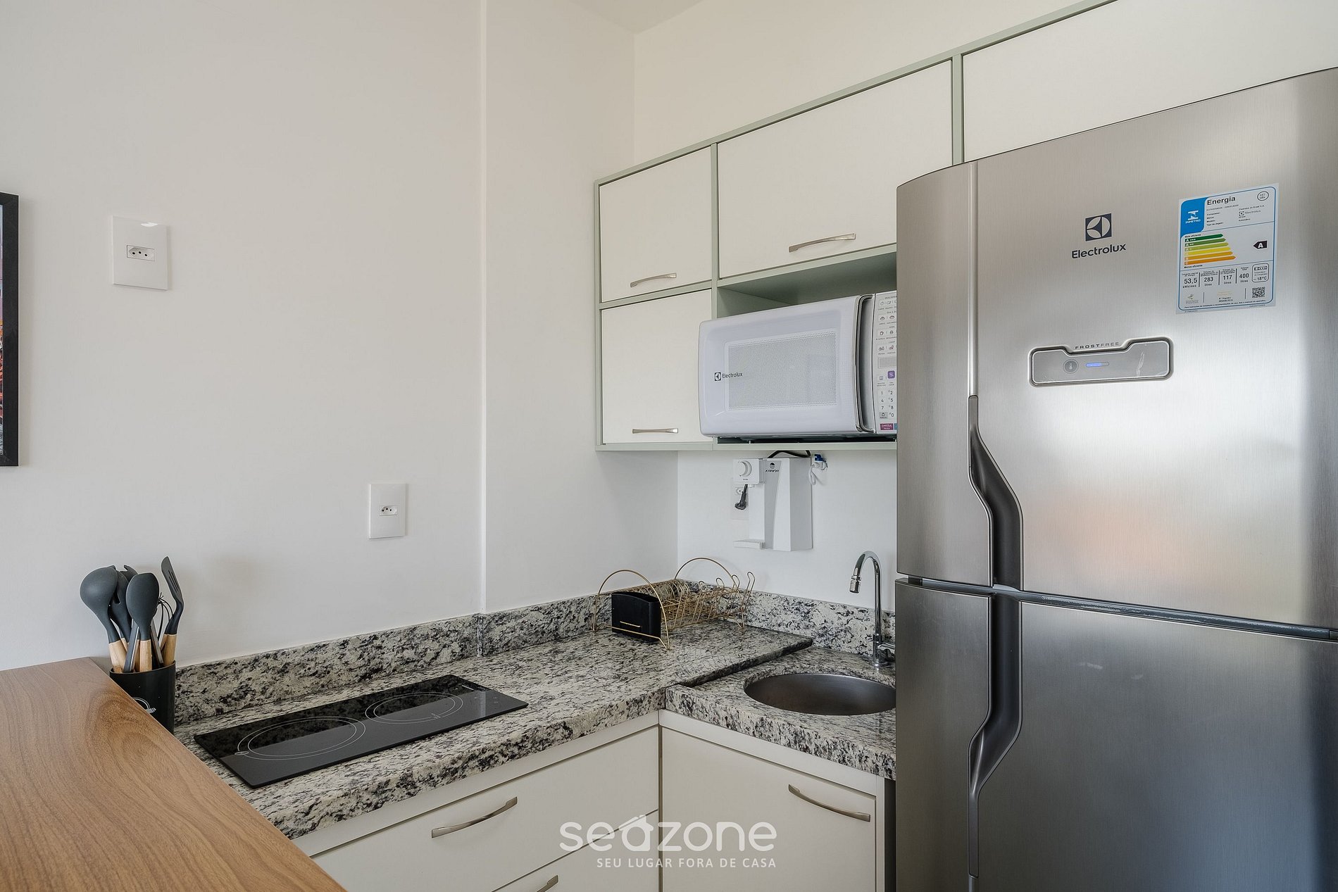 - Cocina completa con refrigerador, anafe, microondas, sandwichera, cafetera eléctrica, hervidor eléctrico, licuadora, copas de vino, sartenes, vajilla, utensilios y encimera;