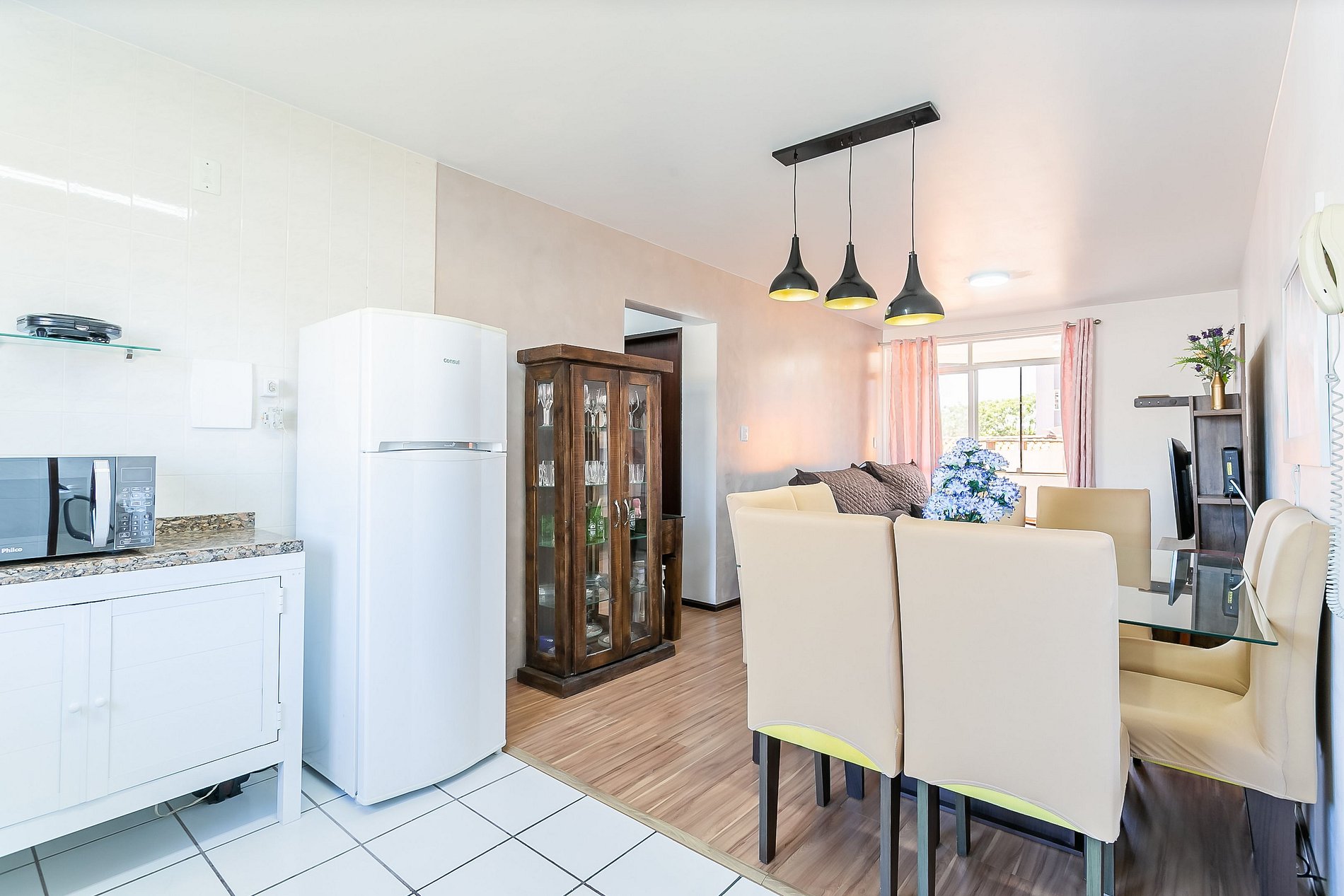 - Sala de estar con sofá, rack, TV, mesa de comedor con 8/ asientos y cocina integrada;
