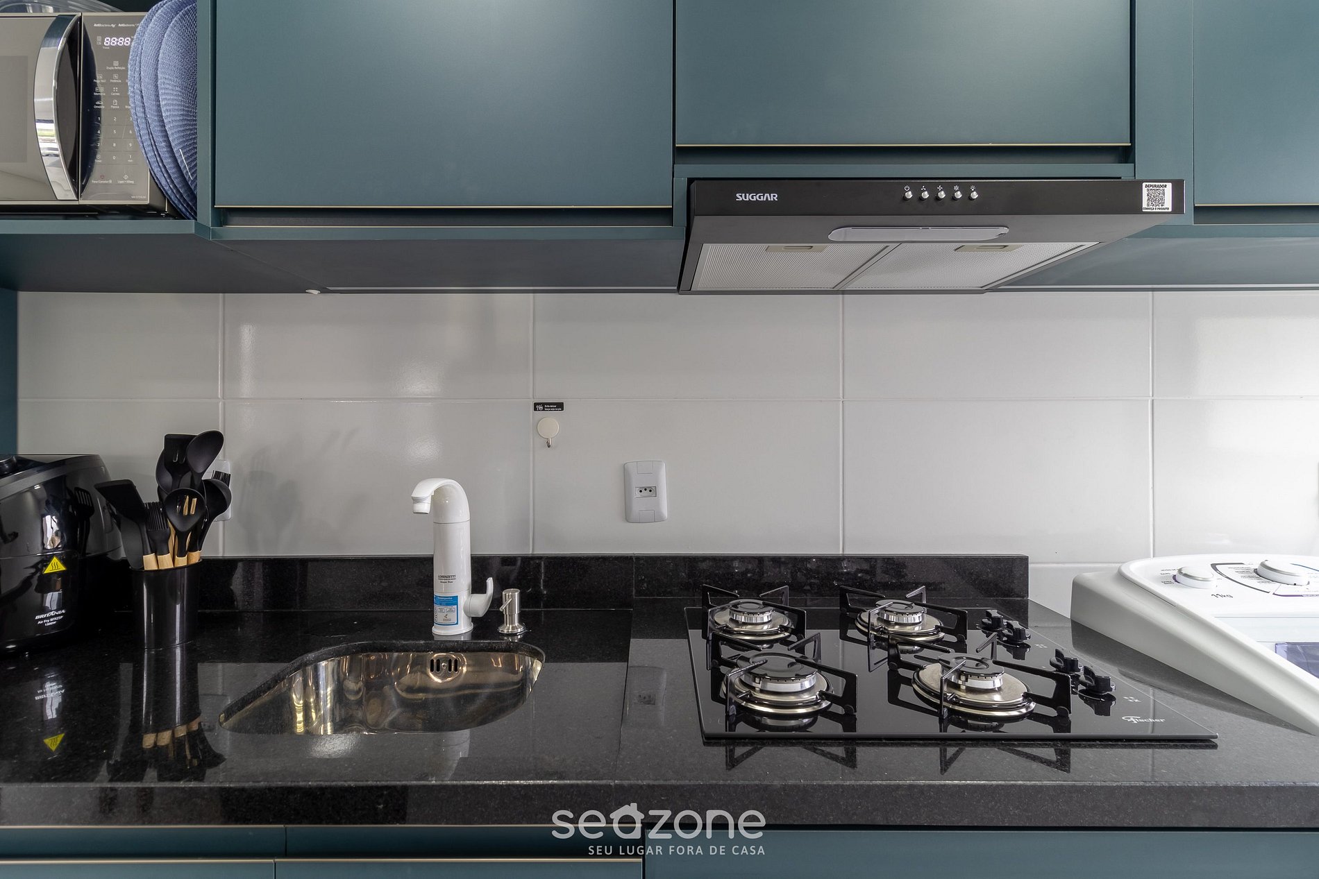 - Cocina completa y funcional, con nevera, cocina de inducción, horno eléctrico, freidora de aire, microondas, sandwichera, hervidor, licuadora, kit de café (embudo, termo), copas de vino, ollas, vajilla y utensilios variados;
