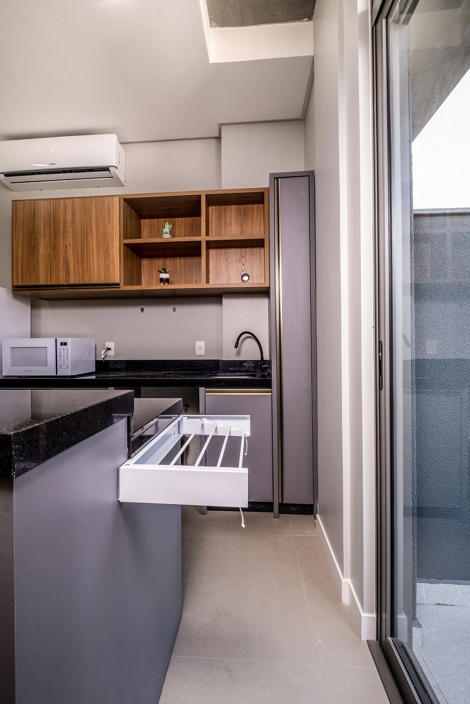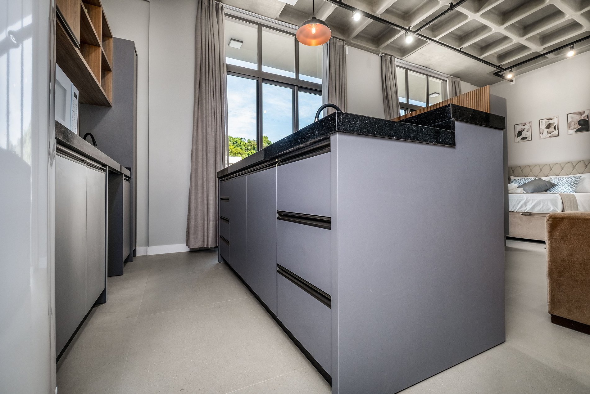 - Espacio de concepto abierto que integra ambientes de dormitorio, sala de estar y cocina;