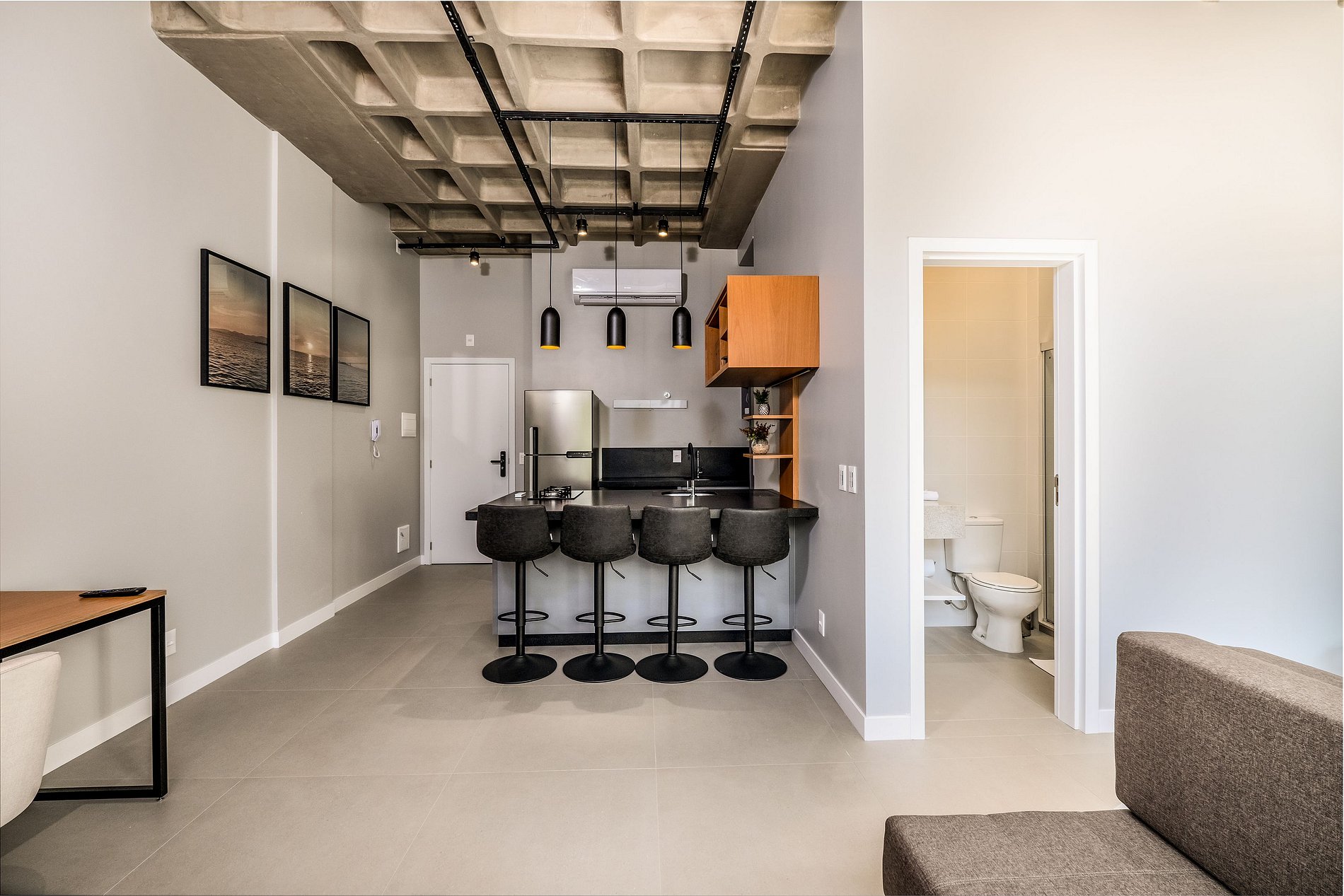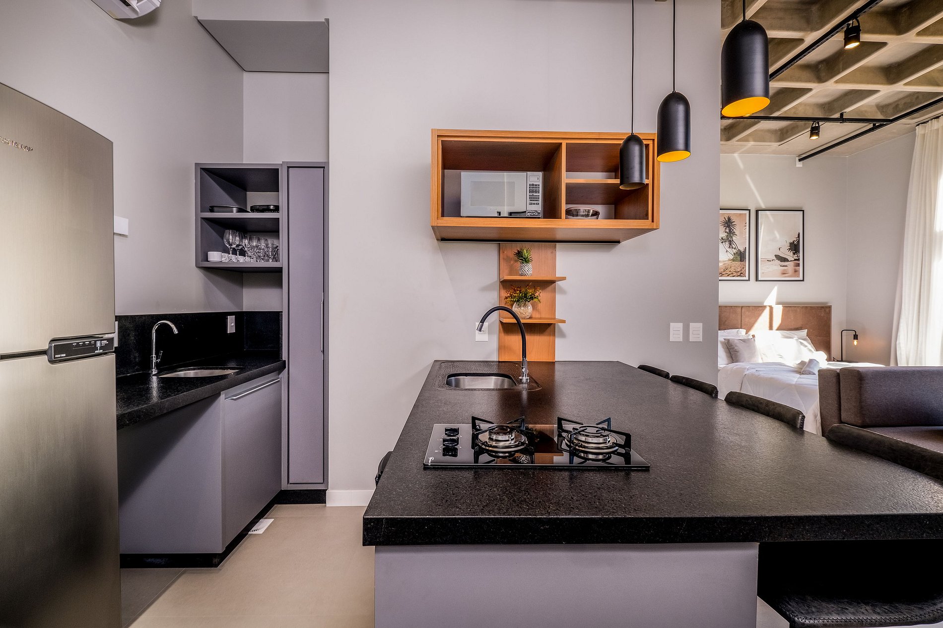 - Espacio de concepto abierto que integra ambientes de dormitorio, sala de estar y cocina;