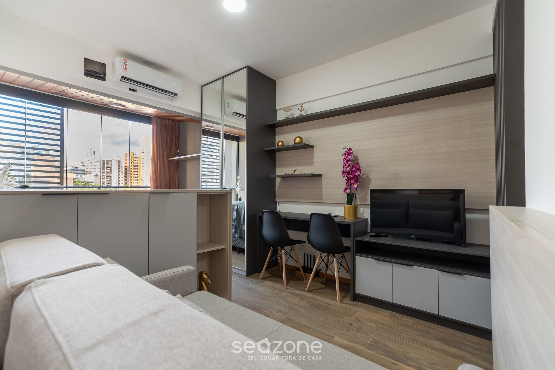 - Cama doble, sofá cama doble, armario, Smart TV, espacio de trabajo y aire acondicionado;