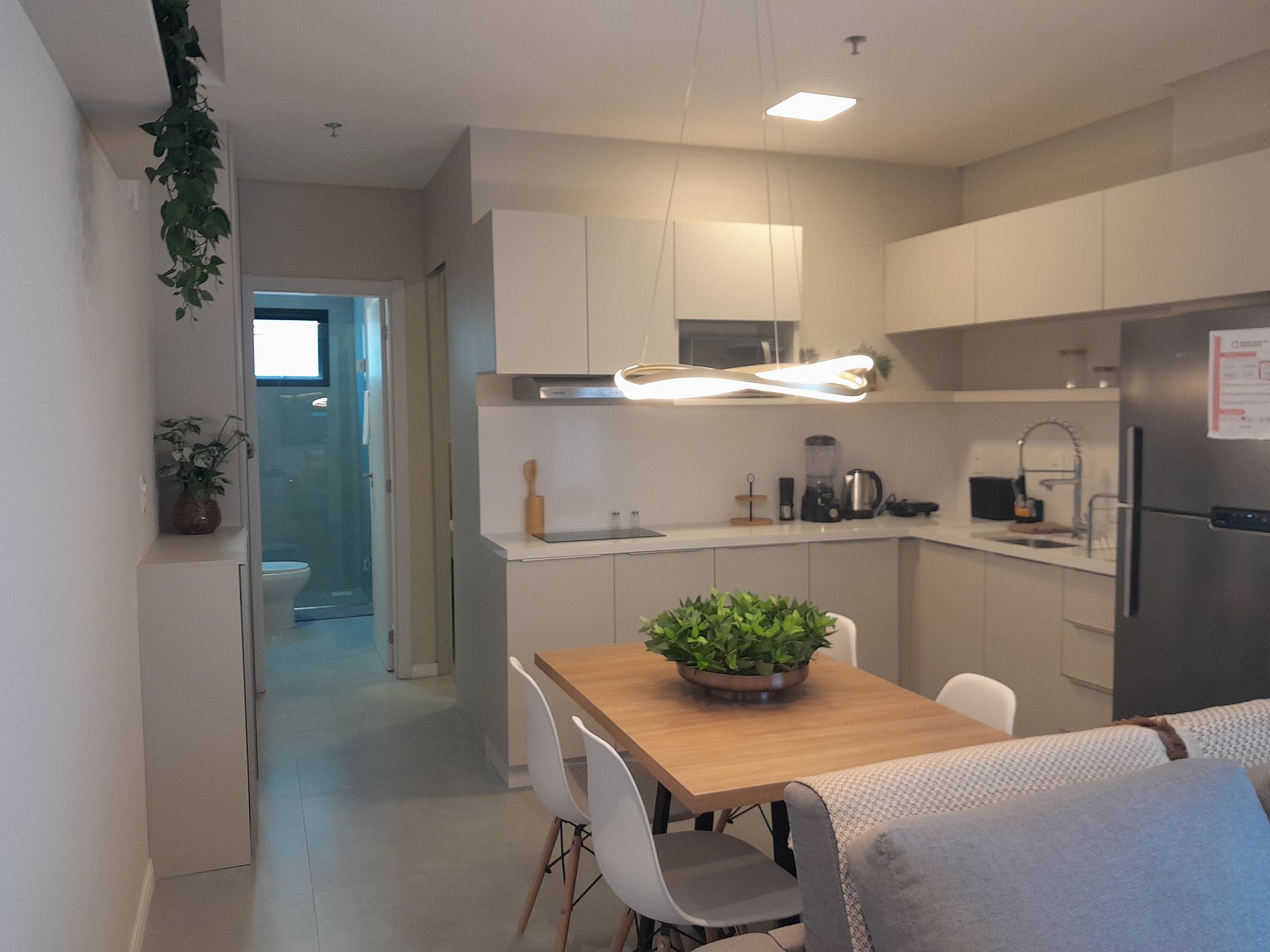 - Cocina totalmente equipada con refrigerador, placa de inducción, microondas, sandwichera, cafetera eléctrica, hervidor eléctrico, licuadora, copas de vino, ollas, sartenes, platos y utensilios;