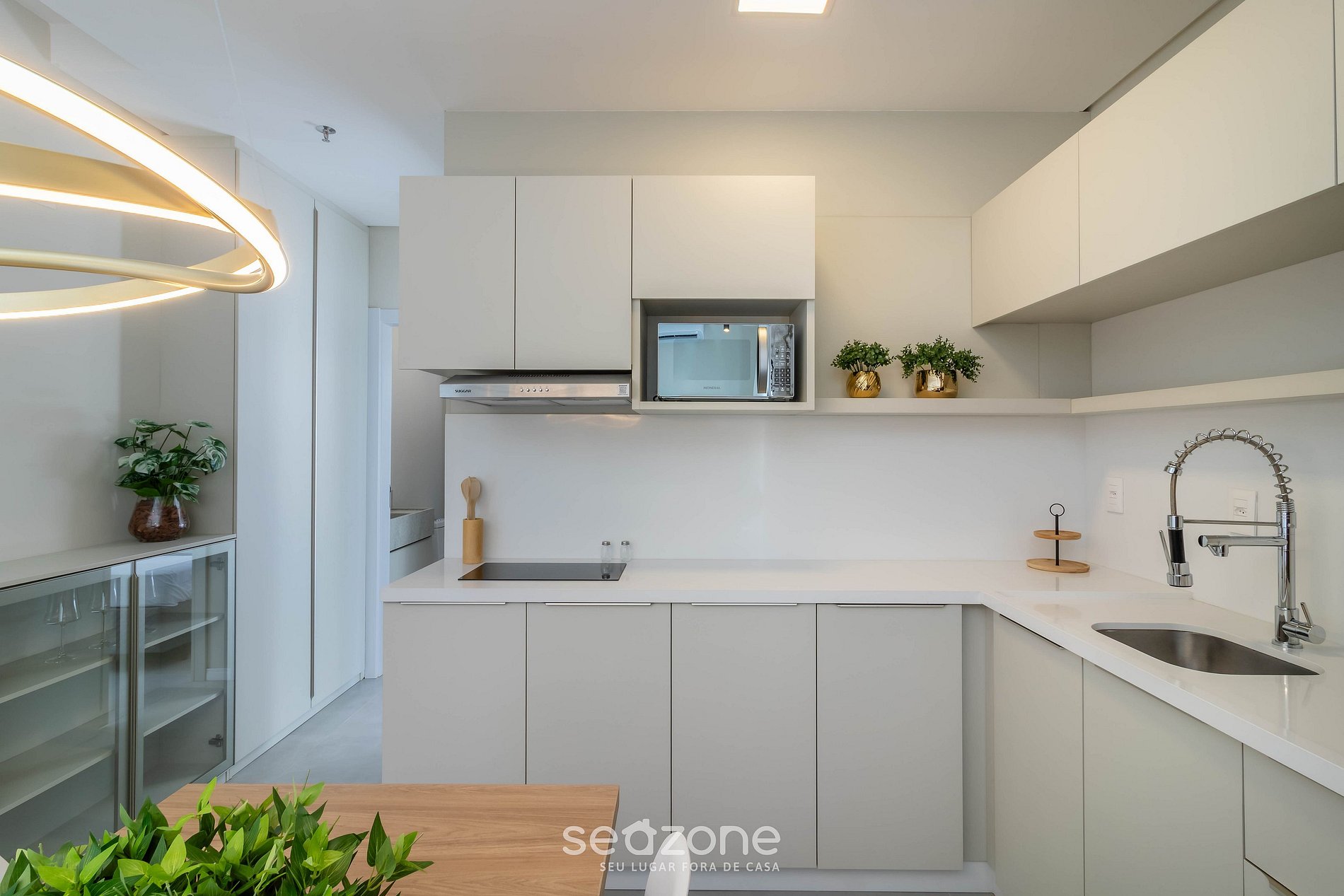- Cocina totalmente equipada con refrigerador, placa de inducción, microondas, sandwichera, cafetera eléctrica, hervidor eléctrico, licuadora, copas de vino, ollas, sartenes, platos y utensilios;