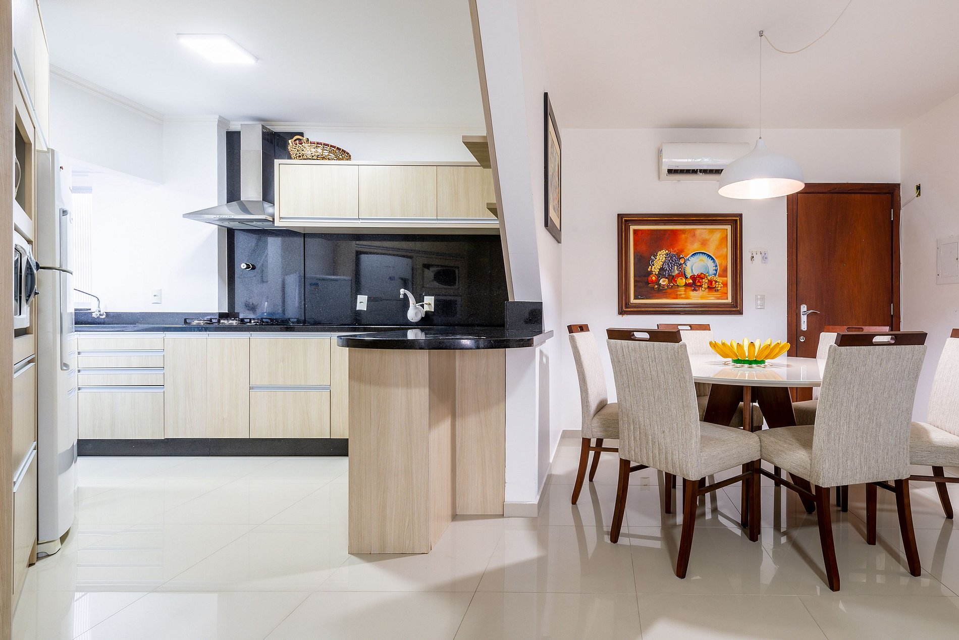 - Sala de estar integrada con el comedor, con sofá, aire acondicionado, TV y mesa de comedor con 6 puestos;