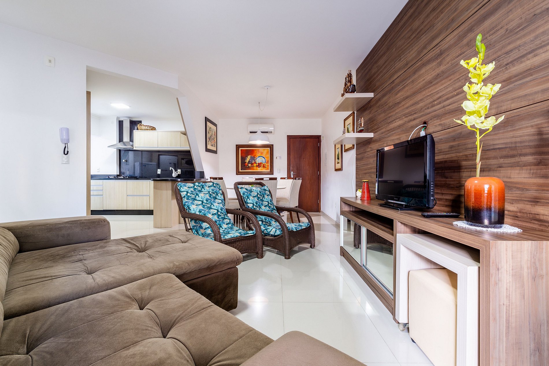 - Sala de estar integrada con el comedor, con sofá, aire acondicionado, TV y mesa de comedor con 6 puestos;