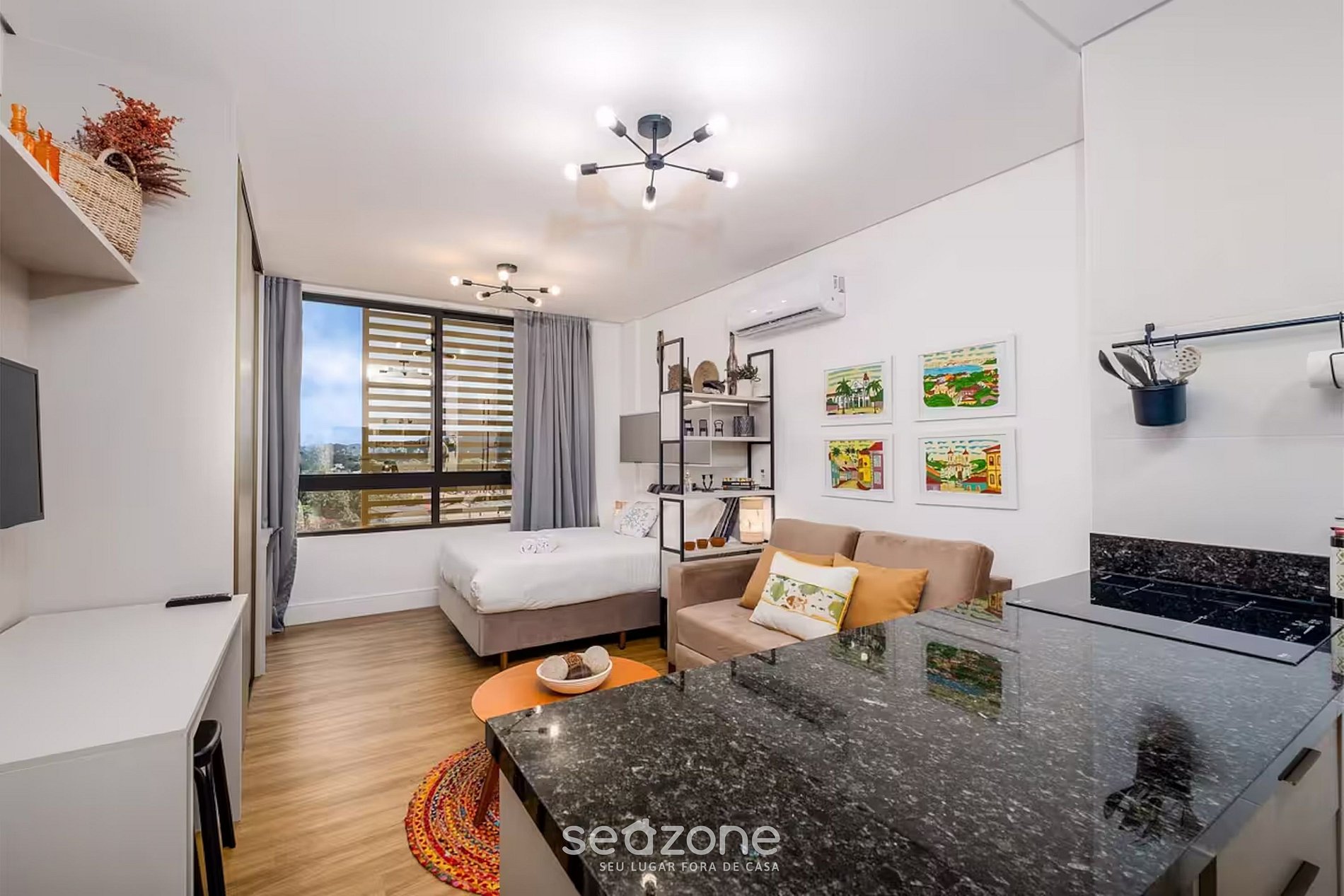 - Cozinha compacta con geladeira, fogão, micro-ondas, cafeteira, Air-fryer, chaleira elétrica, panelas y outros utensílios;