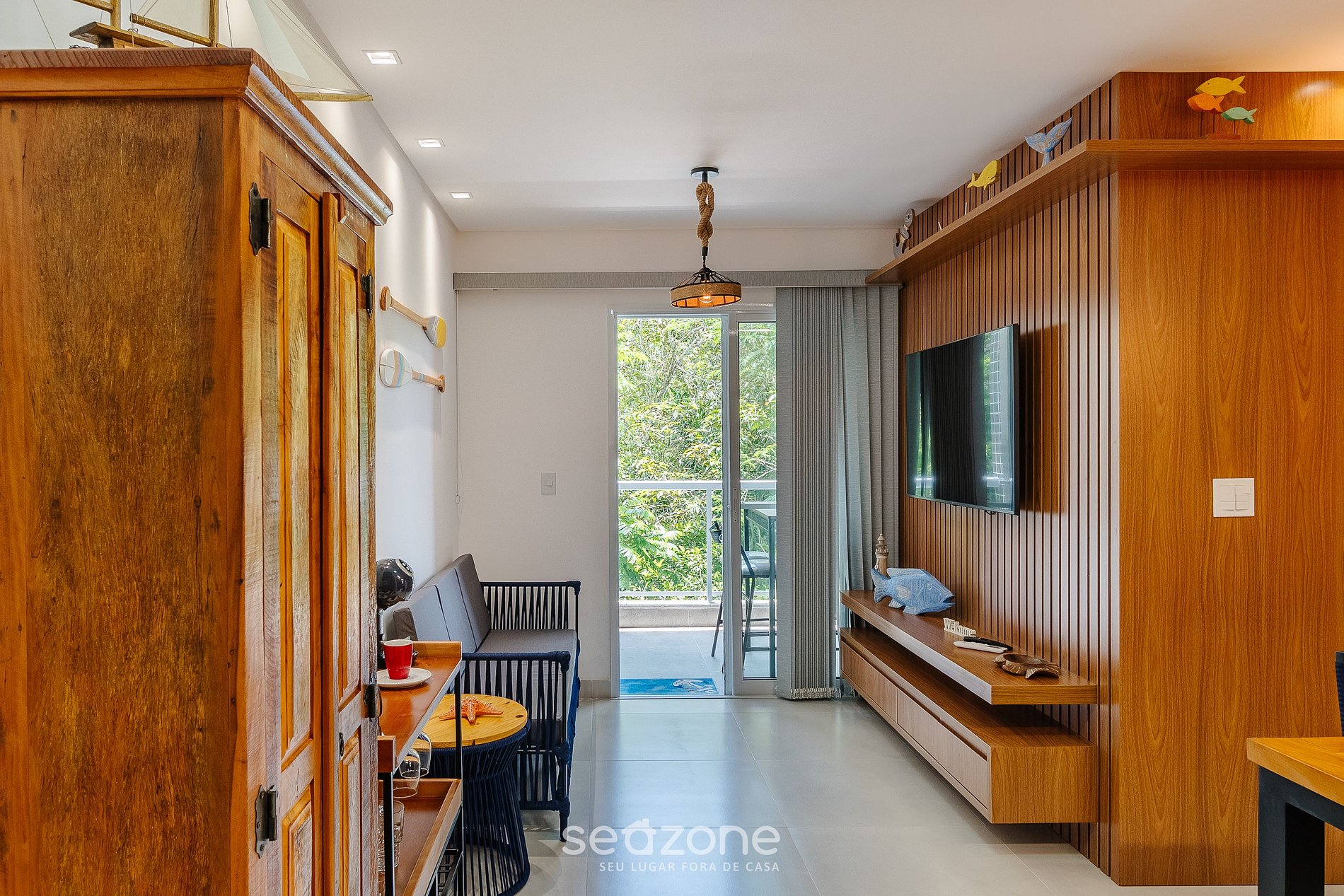 - Sala de estar con sofá, Smart TV y aire acondicionado;