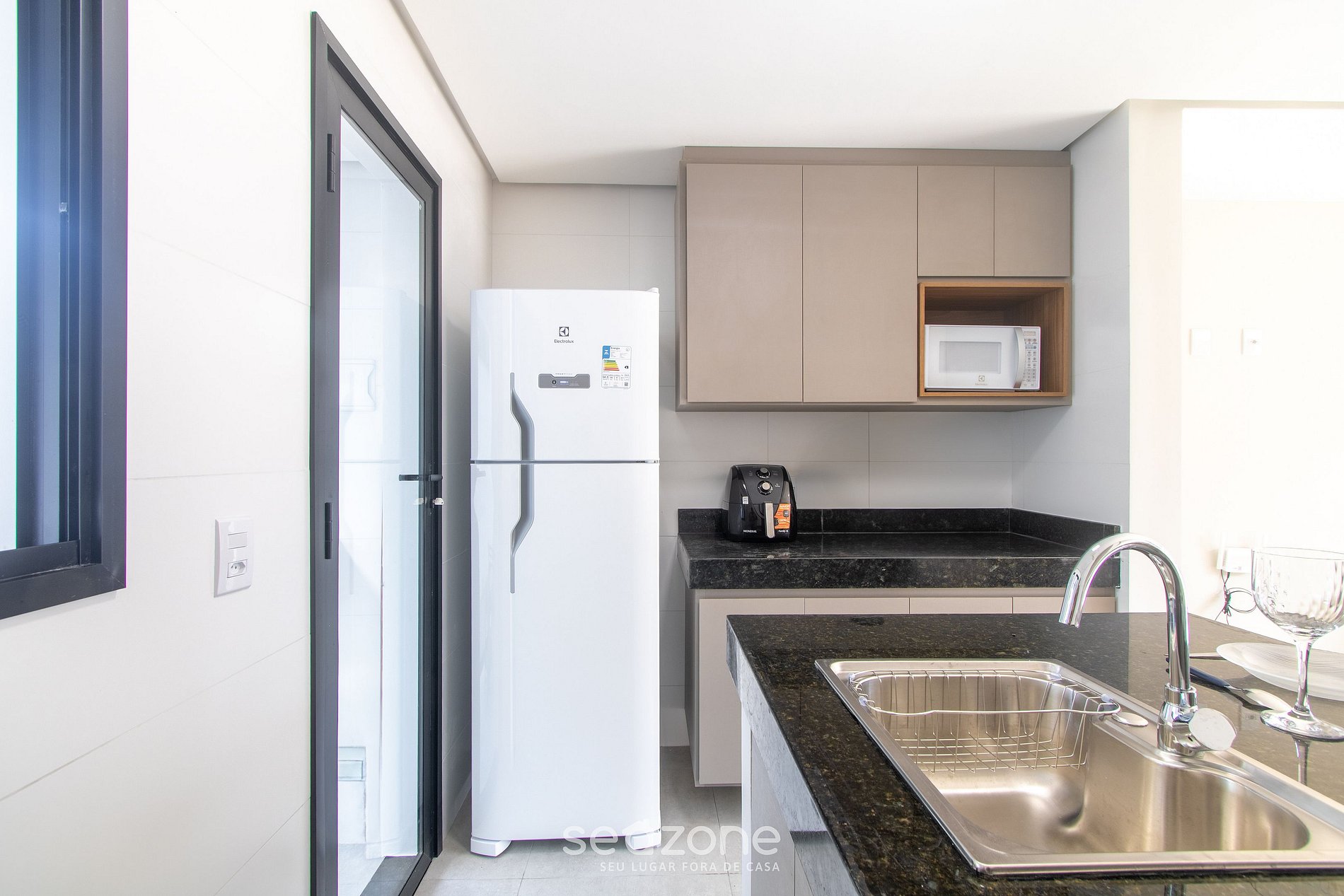- Cocina totalmente equipada con refrigerador, estufa de gas, airfryer, microondas, sandwichera, kit de café (portafiltro, termo), jarra de leche, licuadora, copas de vino, sartenes, vajilla y utensilios;