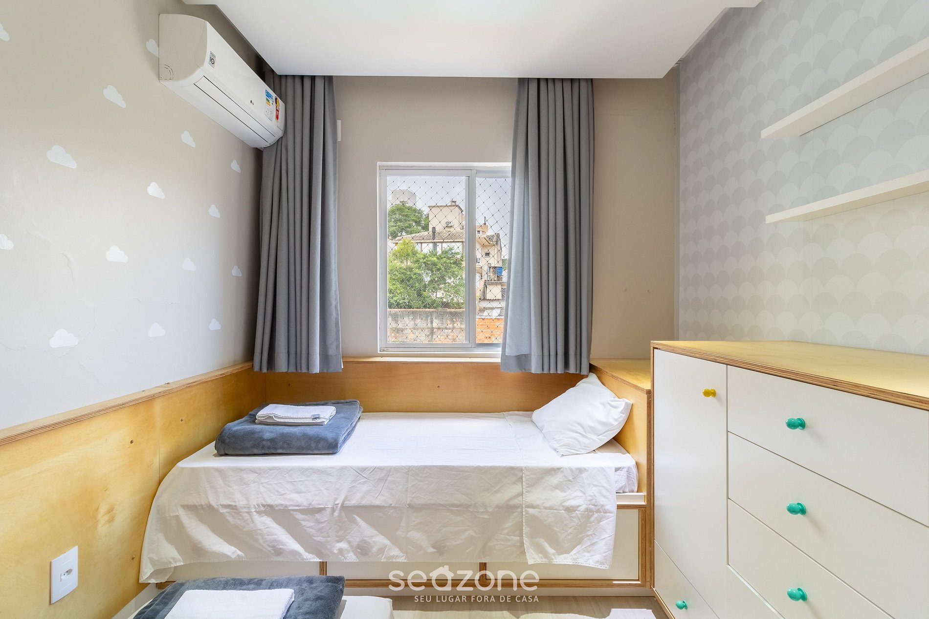 - 1 habitación con cama individual, colchón adicional, cortinas blackout, armario y aire acondicionado;