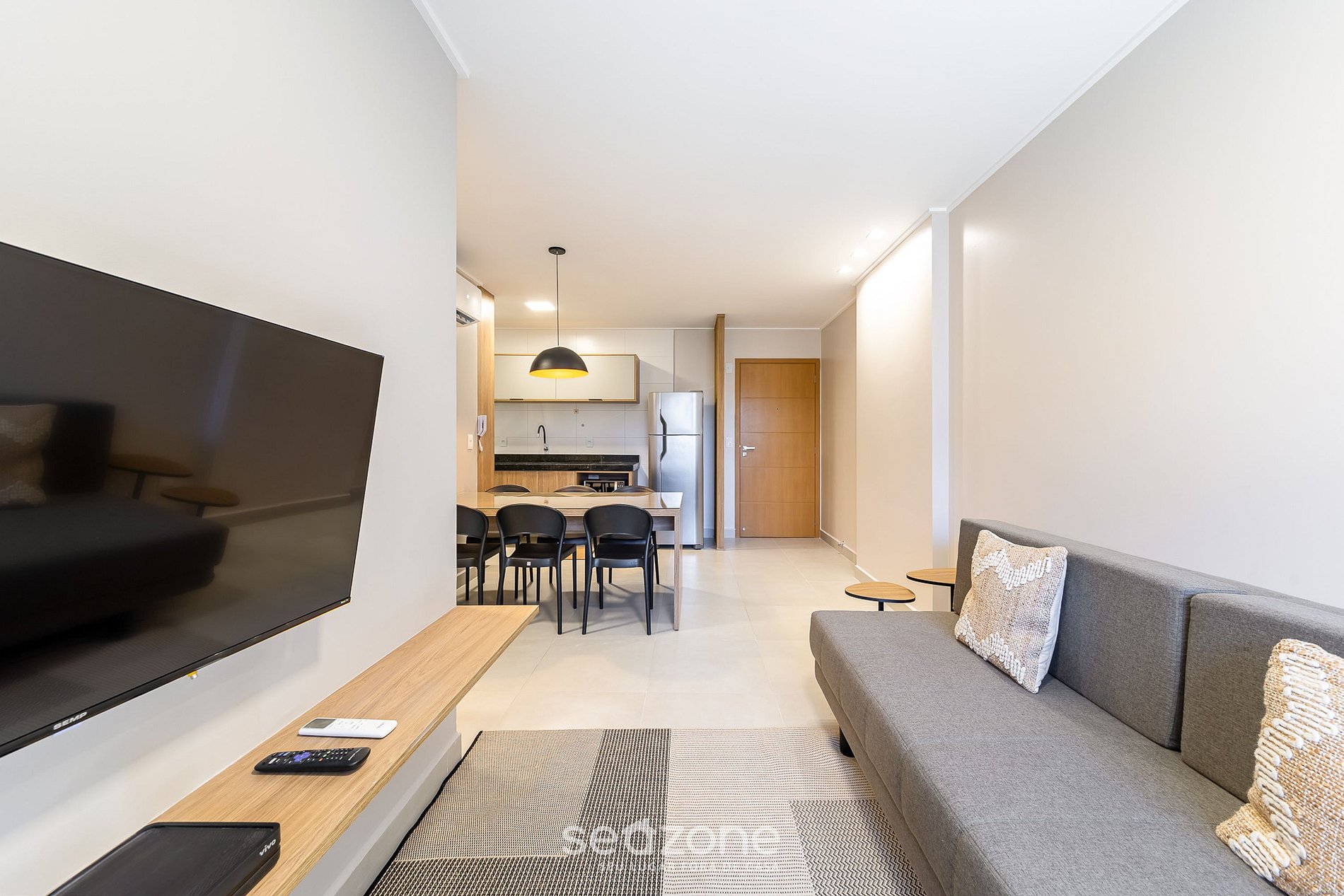 - Sala de estar con sofá, Smart TV y aire acondicionado;