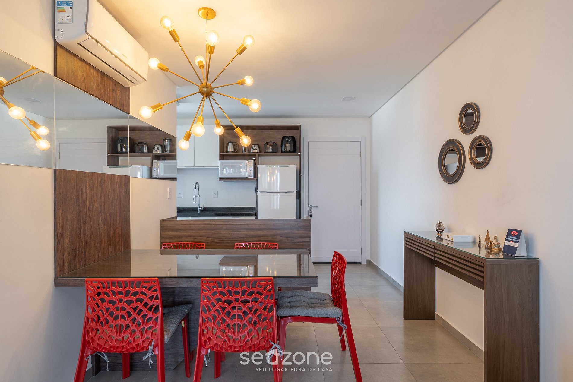- sala de estar con sofá, rack, TV inteligente, aparador, aire acondicionado y mesa de comedor con 5 asientos;