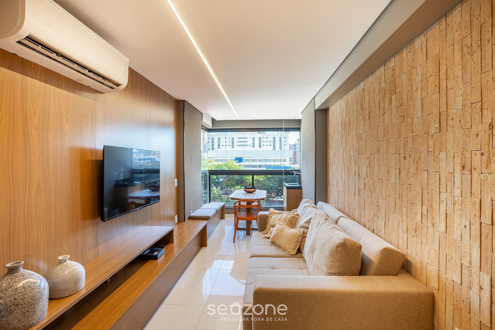 - Sala de estar con sofá, Smart TV y aire acondicionado.