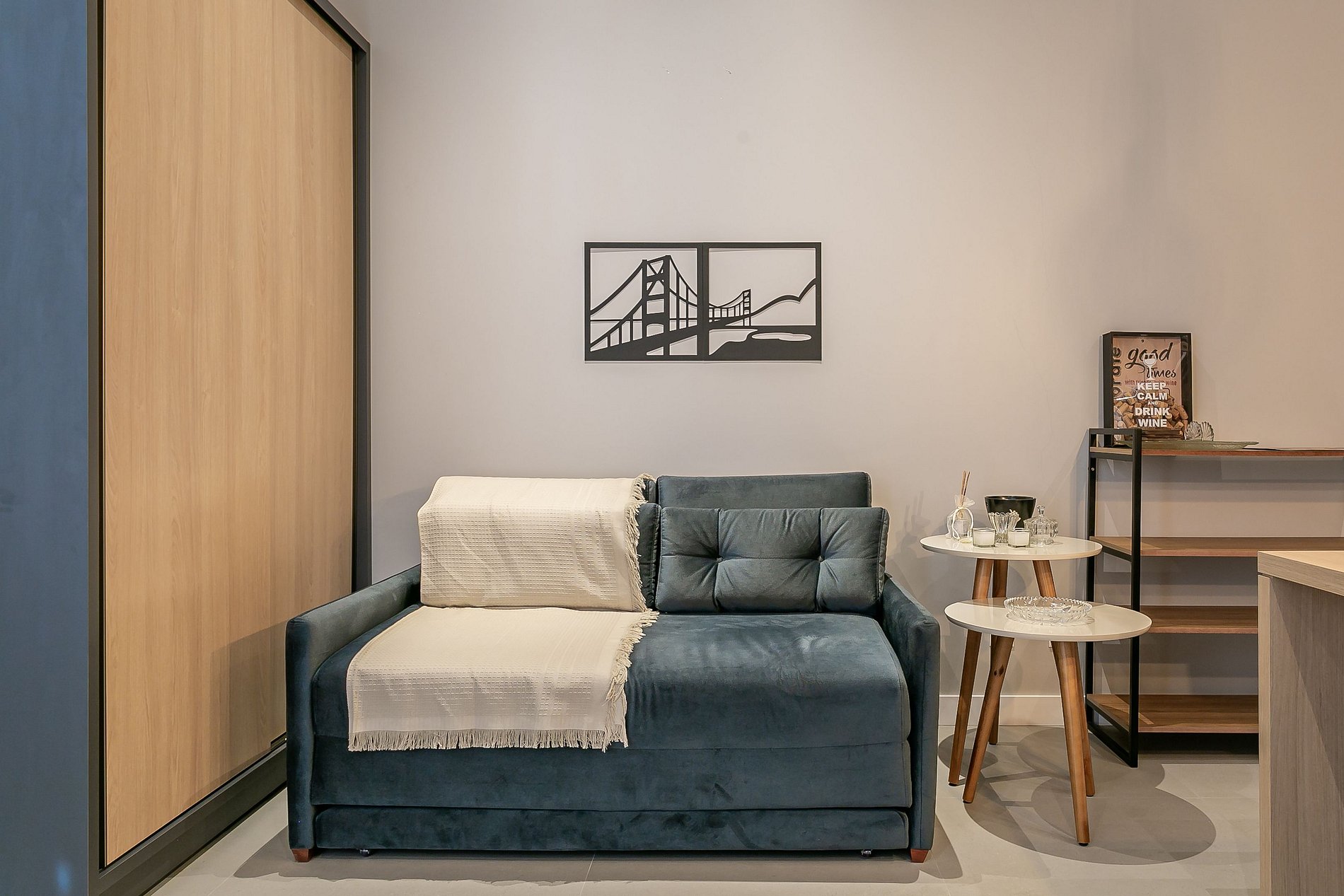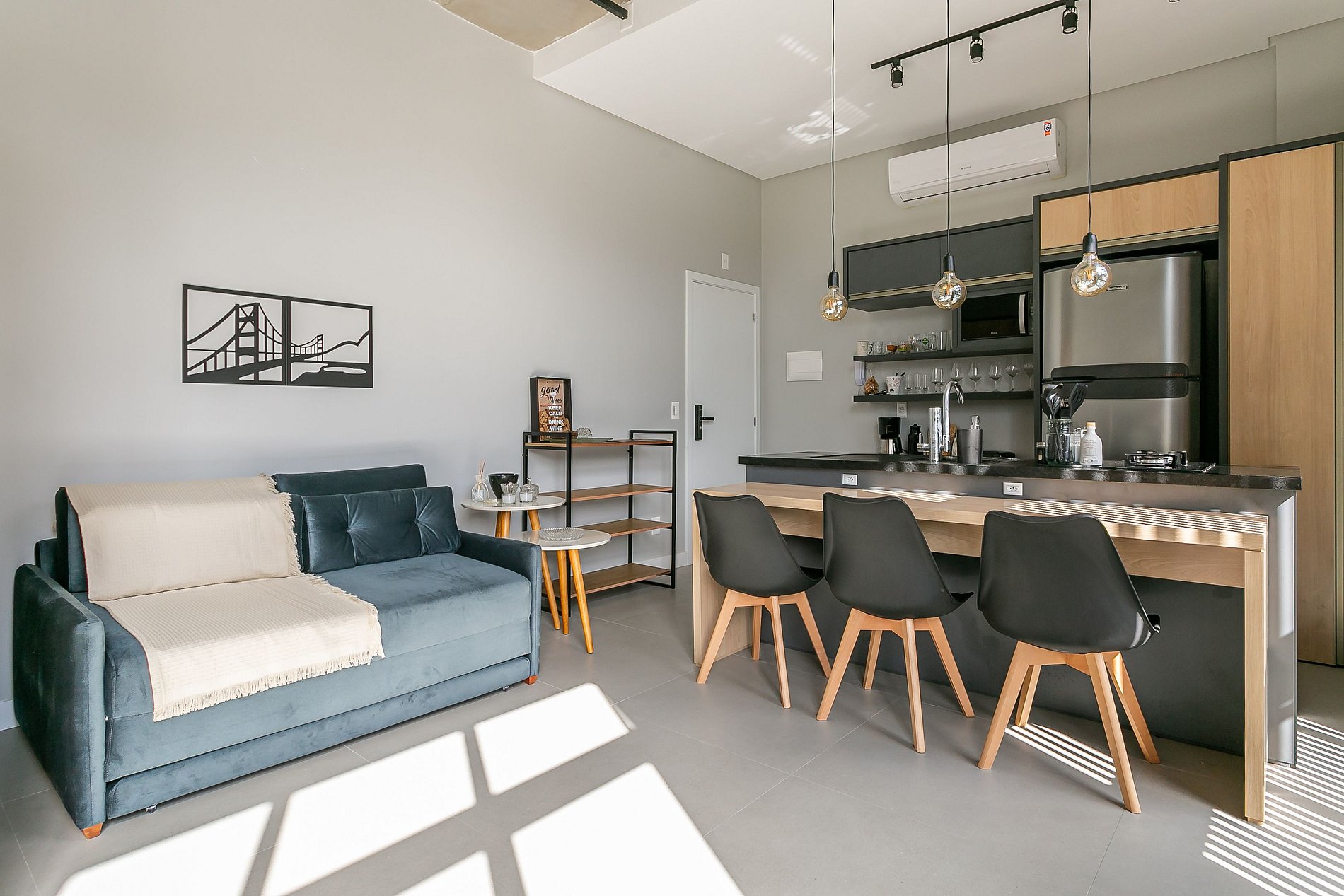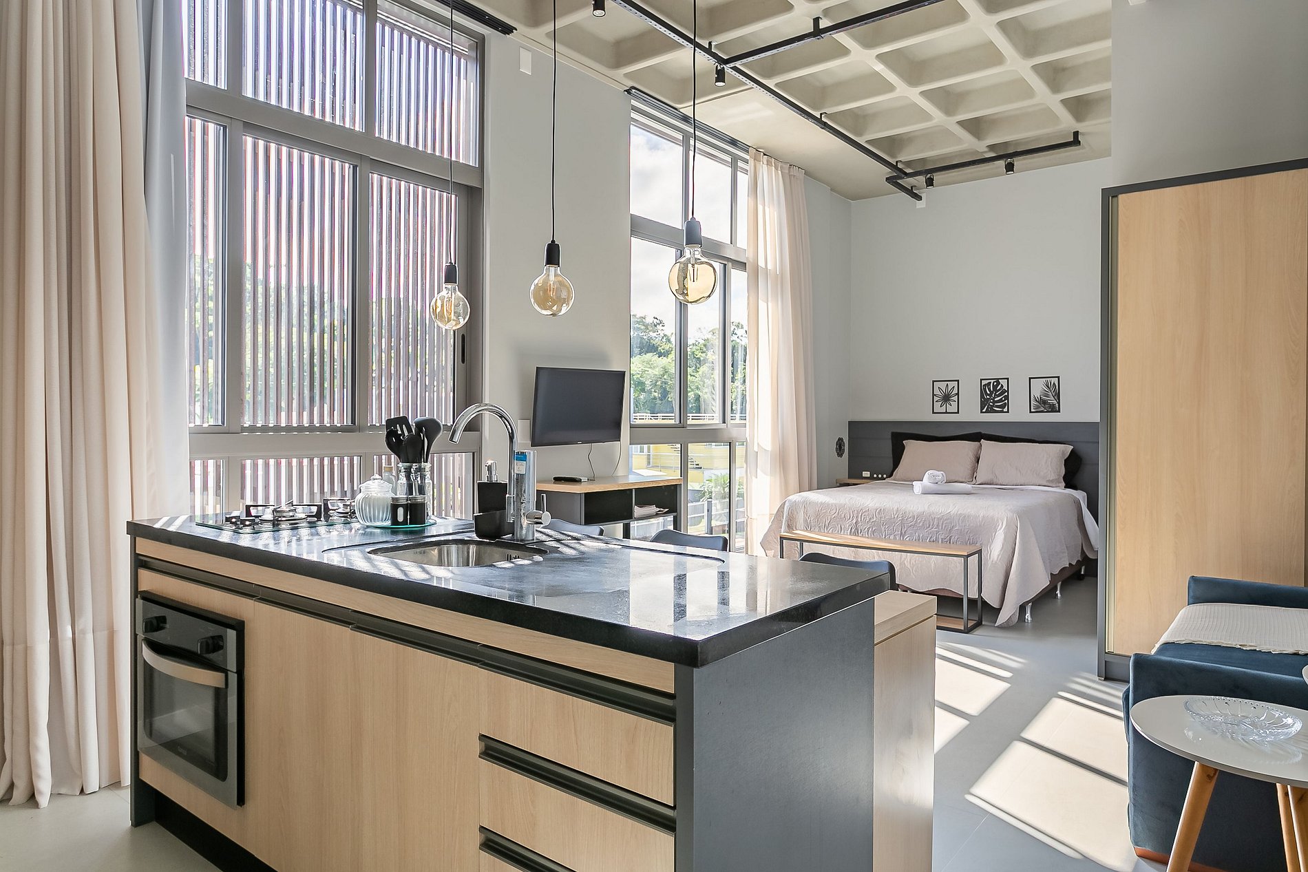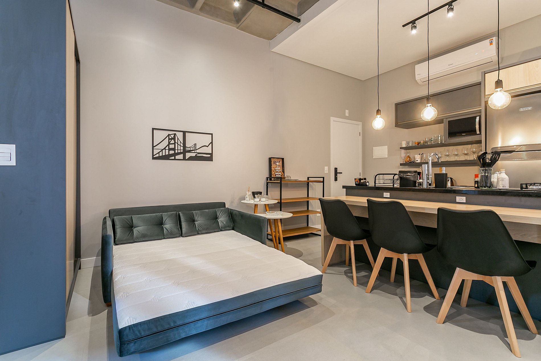 - Espacio de concepto abierto que integra ambientes de dormitorio, sala de estar y cocina;