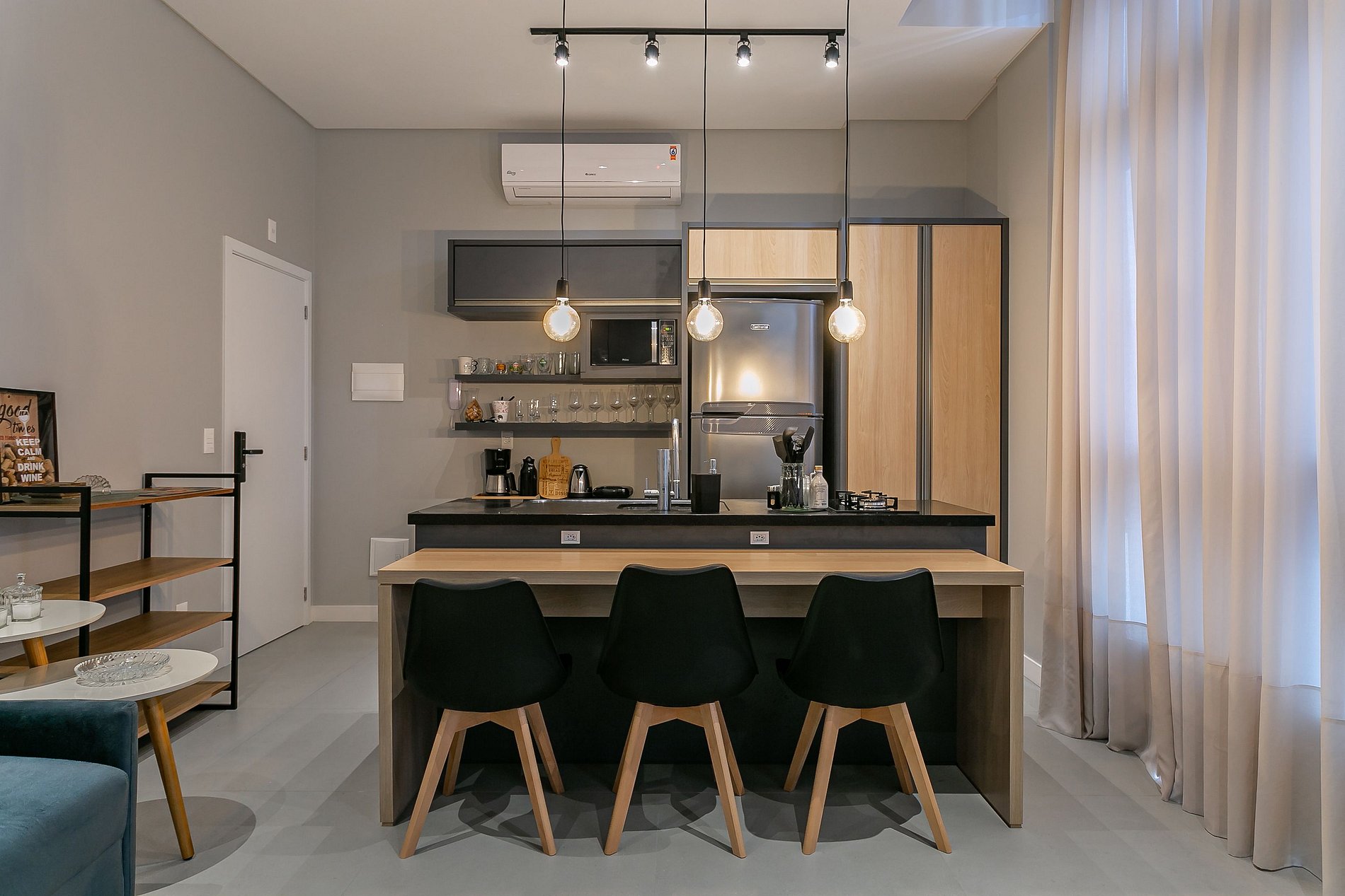 - Cocina compacta con heladera, anafe, microondas, sandwichera, cafetera, pava eléctrica, licuadora, sartenes, vajilla y utensilios;