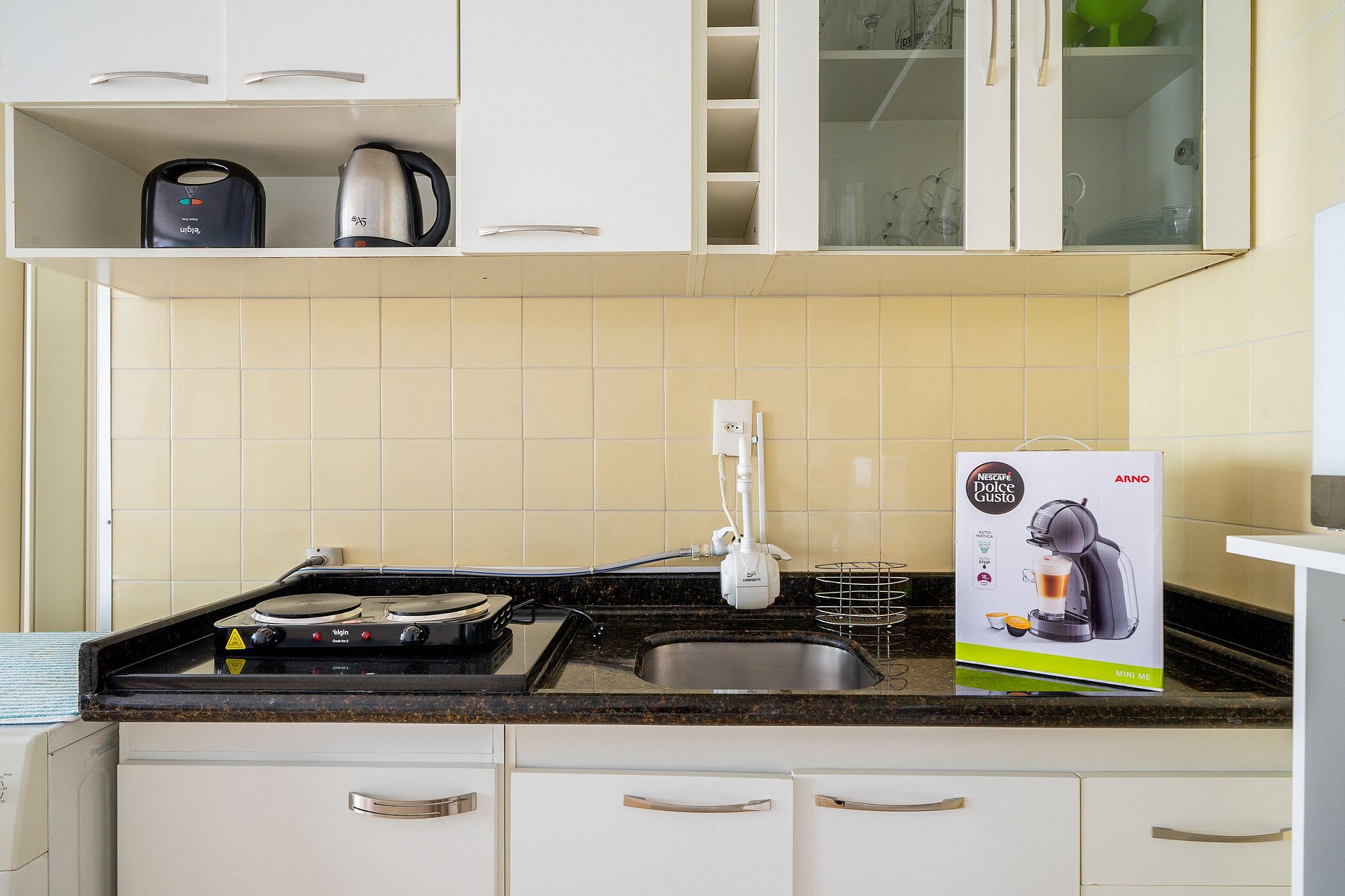 - Cocina completa con ventilador de techo, cocina eléctrica de 2 fuegos, nevera, microondas, fregadero con grifo de agua caliente, sandwichera, pava eléctrica, cafetera dolce gusto, freidora, ollas, vajilla y utensilios;